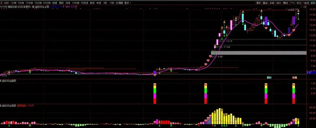 5、15<强度≤20:洋红色柱体,资金强力拉升;