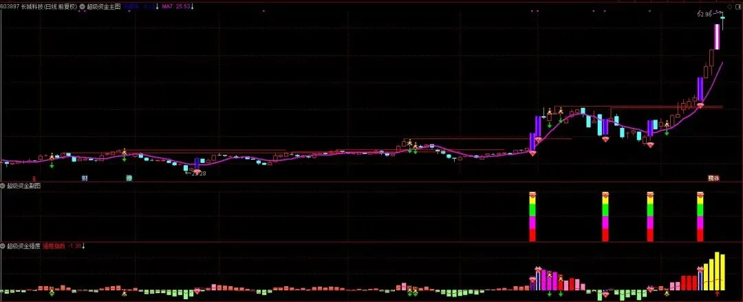 特殊信号:当日资金强度较前一日增幅≥7.5,柱顶显示红钻图标,柱内出现蓝色小柱,重点关注。