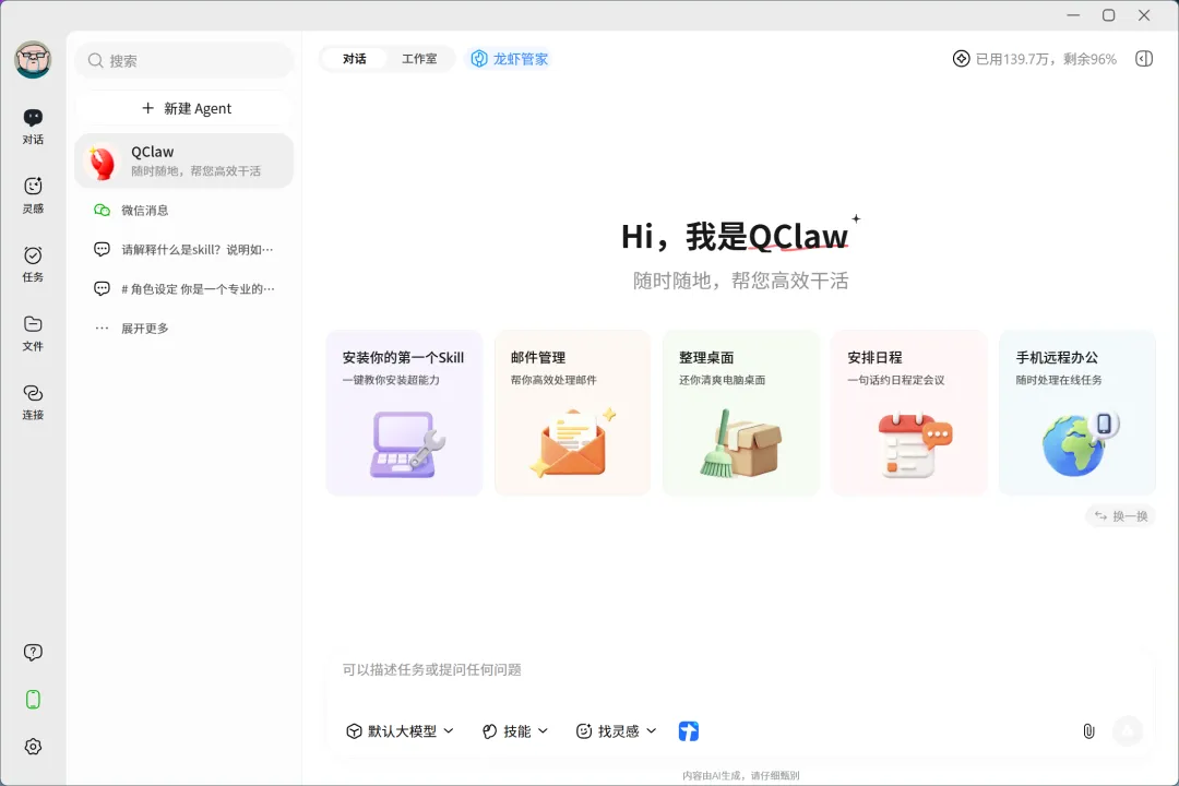 Qclaw(腾讯数字龙虾)是腾讯推出的AI智能助手,专门为个人用户设计,让任何人都能轻松使用AI帮你干活。