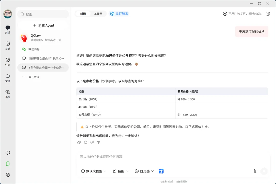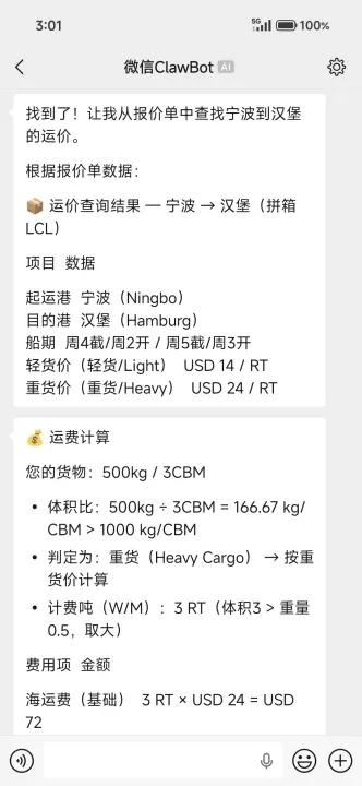 2. 你在微信里问Qclaw:帮我查一下上海到汉堡的运价