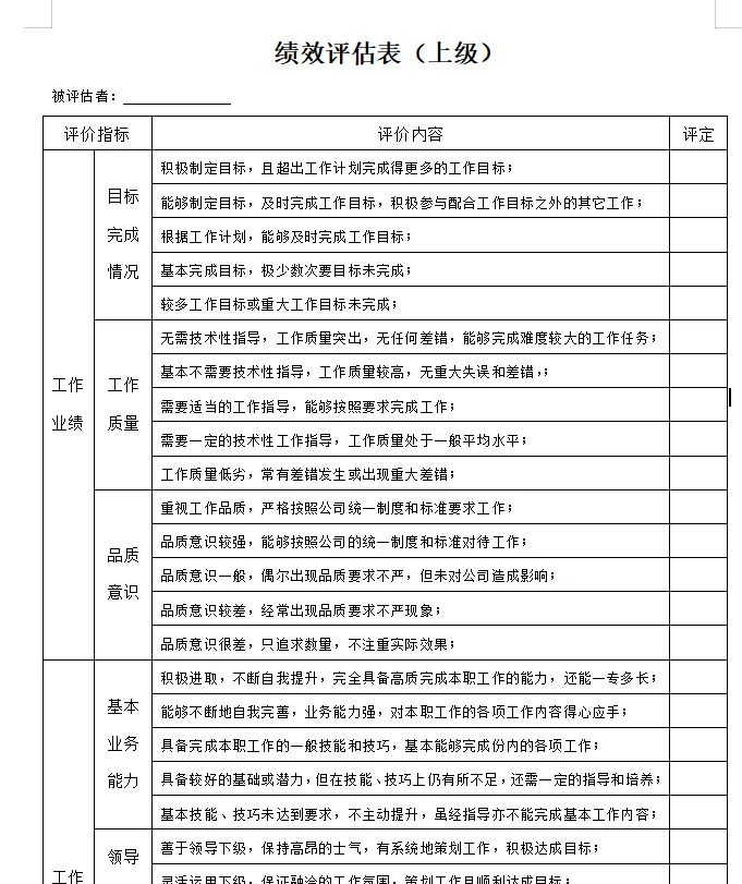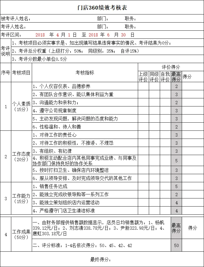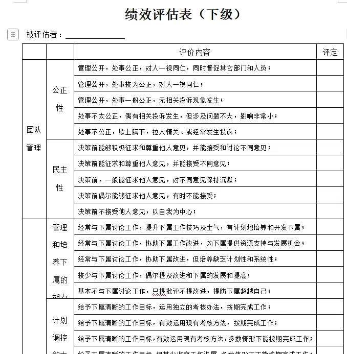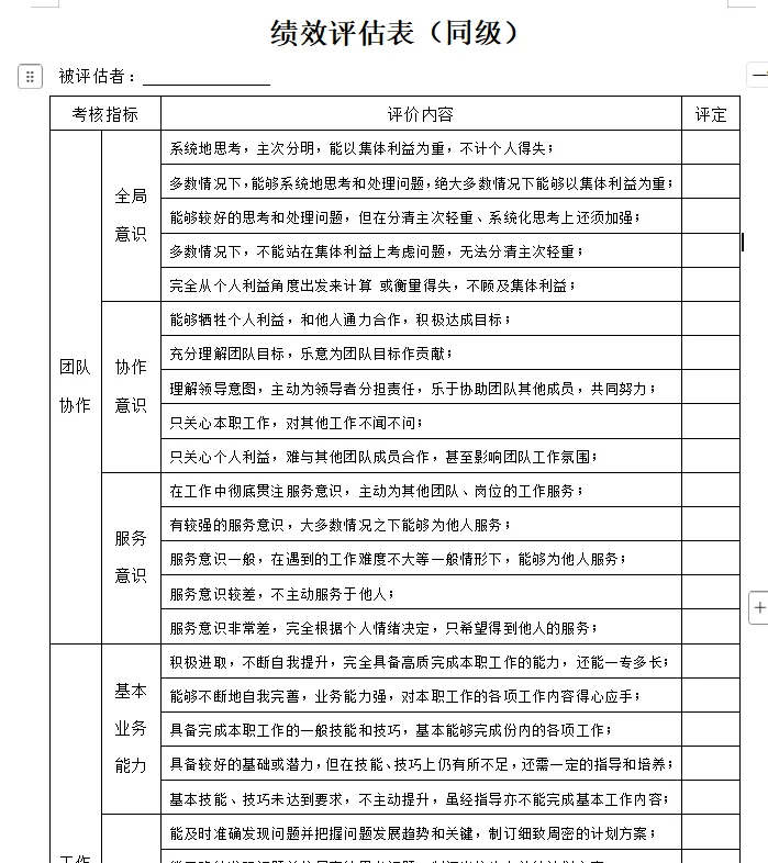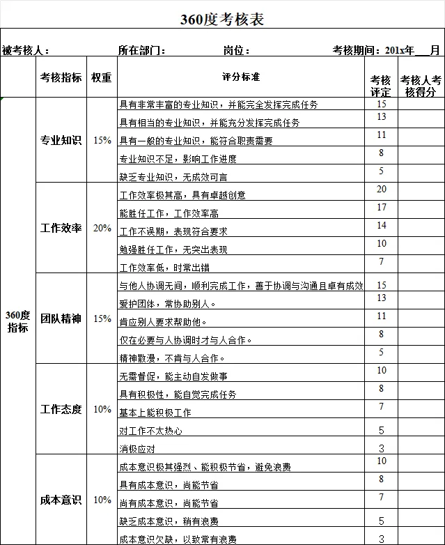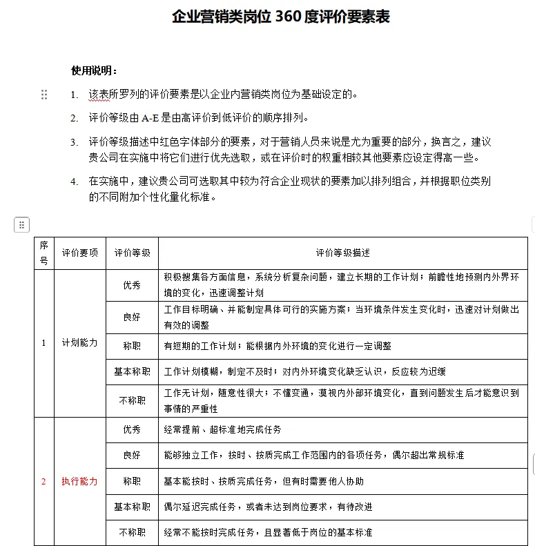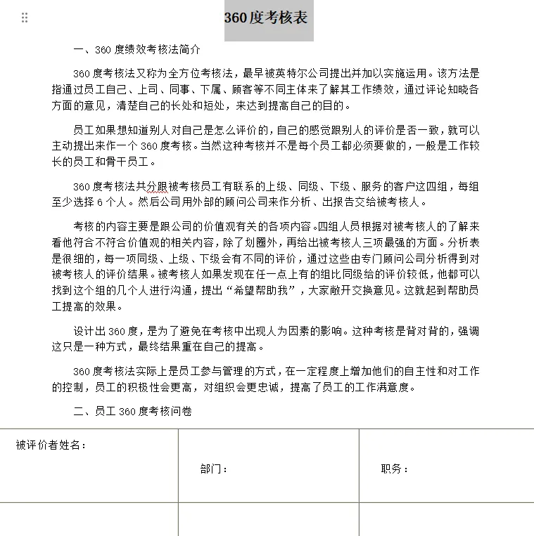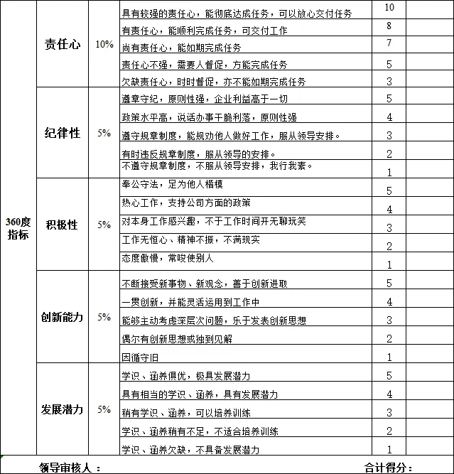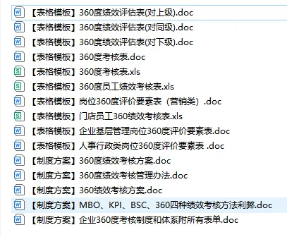 5大绩效考核方案word&excel——360度考核|人事主管必备表格 1.绩效评估表(上级) 2.绩效评估表(同级) 3.绩效评估表(下级) 4.360度考核表 5.360度考核表2 6.营销类岗位360度评价要素表 7.门店360绩效考核表 8.基层管理岗位360度评价要素表 9.人事行政类岗位360度评价要素表 10.360度绩效考核体系 获取方式: 公众号聊天窗口回复:360