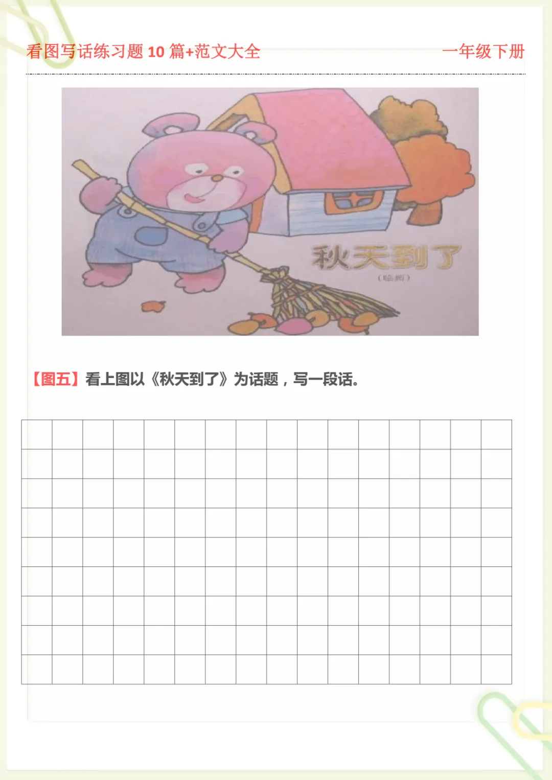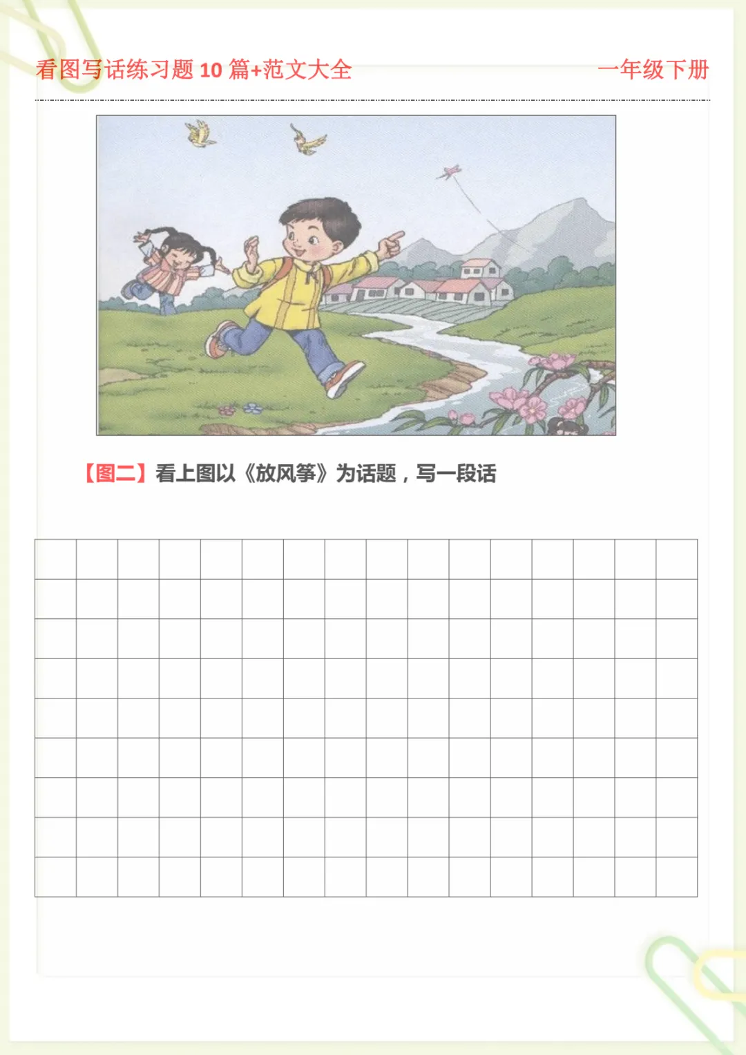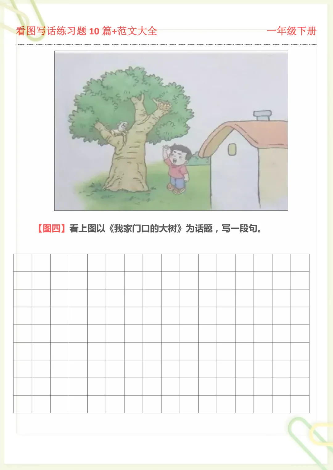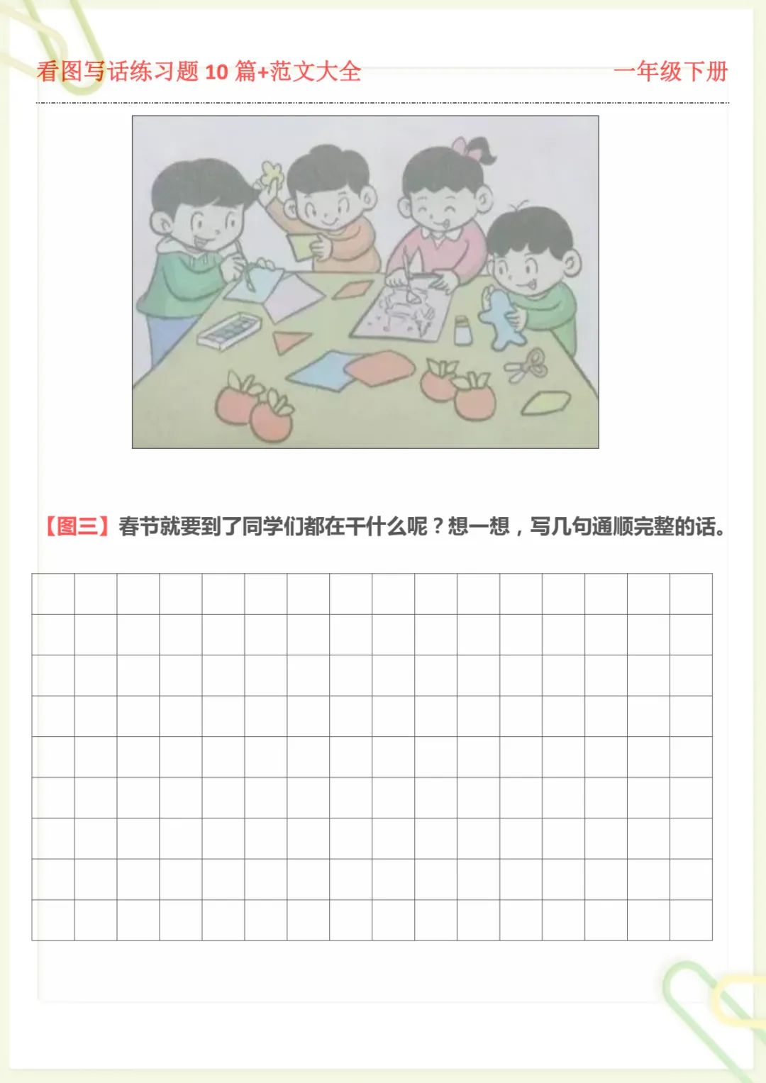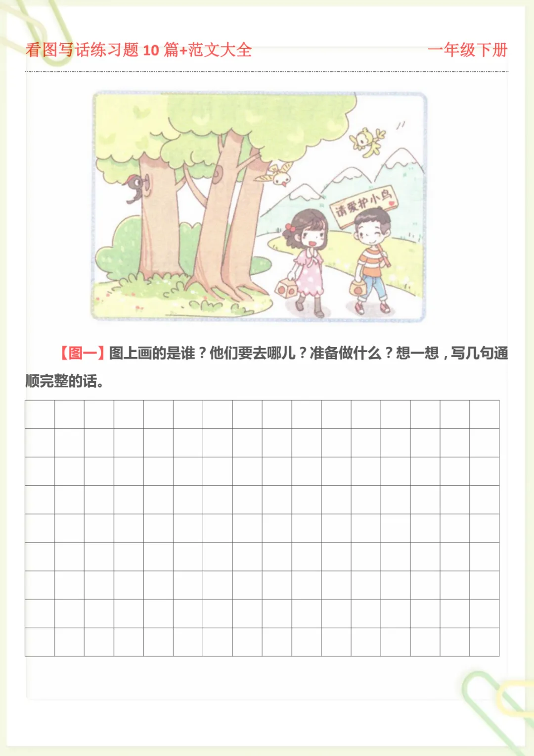 【看图写话练习题】一下语文,共13页,电子版可下载可打印,适合一年级孩子进行语文看图写话专项练习使用。这份资料围绕看图观察、语句表达、内容组织等基础训练展开,涵盖多个核心知识点与专项训练内容,帮助孩子在练习中逐步提升观察能力、语言表达能力和写话基础。需要的家长可以提前下载打印出来,让孩子在课后练一练,更有针对性地巩固所学内容。