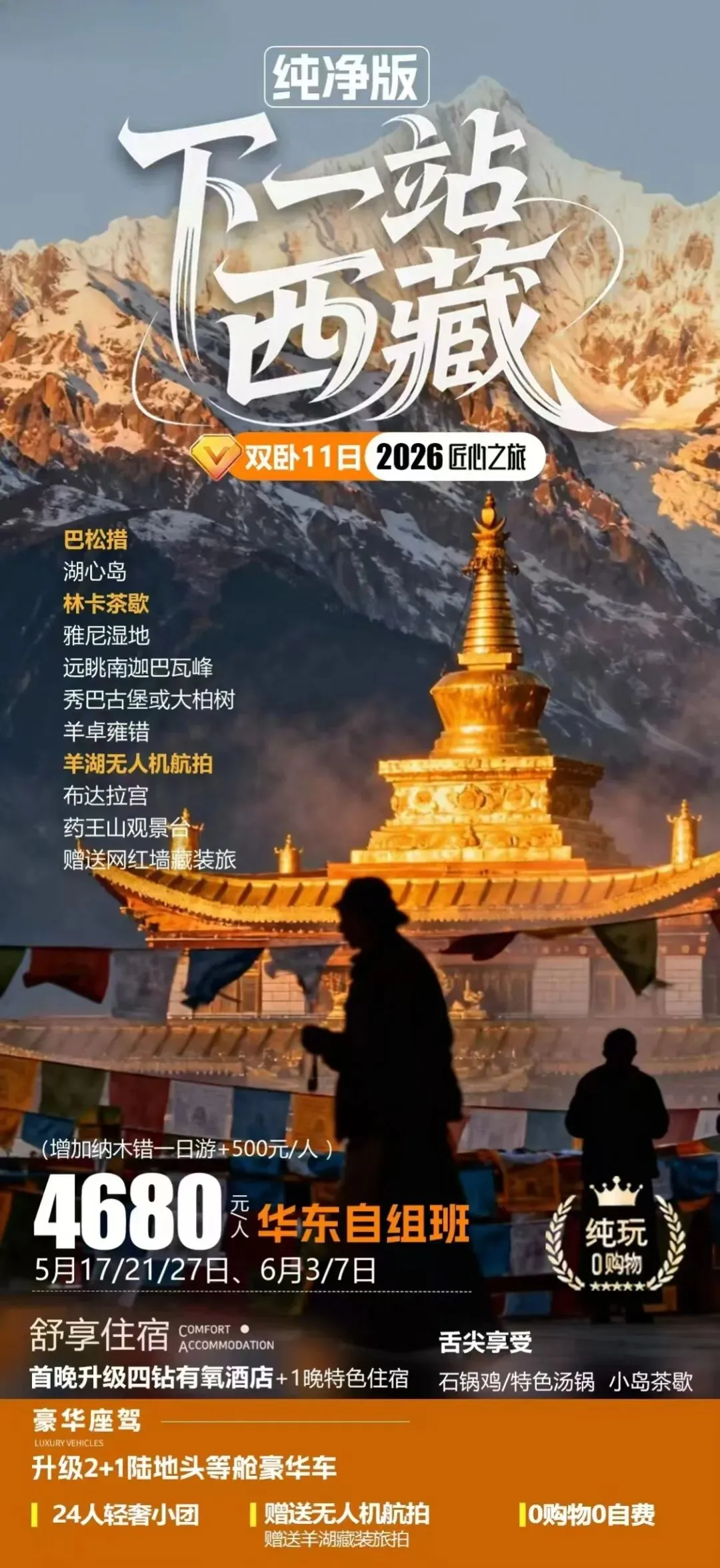 巴松措 湖心岛 林卡茶歇 雅尼湿地 秀巴古堡/大柏树 羊卓雍错 羊湖无人机航拍 布达拉宫 药王山观景台 赠送网红墙藏装旅拍 纯玩双卧11日游