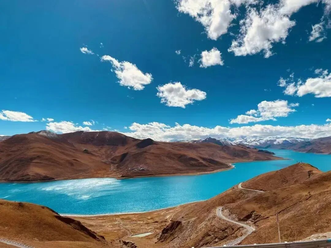 【羊卓雍措】羊卓雍措宛如一条飘带挂在天地间,清澈的湖水、巍峨的雪山、如洗的蓝天融为一体,如画的风景让人陶醉。在《画皮2》的杀青地,感受圣湖之美、圣湖之纯、圣湖之静。羊卓雍措是西藏三大圣湖之一的淡水湖,湖水如羊脂般清澈,湖水甘甜,可以饮用。湛蓝的湖水与远方的雪山连为一体,加上两岸各色的山脉、极具特色的藏民族村落、遍地的牛羊,一路走来,心旷神怡。羊湖湖水面积638平方公里,湖面海拔4441米,湖岸线长达250千米。此湖也被认为是神女遗落在人间的松石耳串。羊卓雍措像一块镶嵌在群峰之中的蓝宝石,碧蓝的湖水平滑如镜,明蓝映天。来到西藏三大圣湖之一-羊卓雍措,换上一套美美的藏装,与神山圣湖来一个美美的合影,留下感动回忆!参观完后,返回拉萨市区。