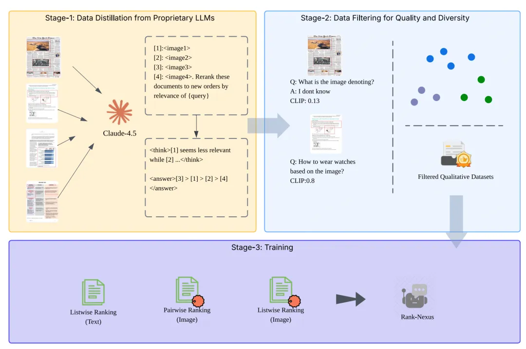 解决图像列表级重排数据极度稀缺的问题,基于MMDocIR基准构建数据,分三步: 用CLIP计算查询-图像余弦相似度,过滤低相关样本,剔除噪声监督信号;使用贪婪最大多样性选择;图像数据蒸馏:用Claude-4.5-Haiku对每个查询的Top-20图像候选生成列表级重排标签。