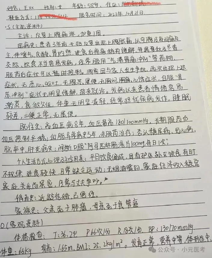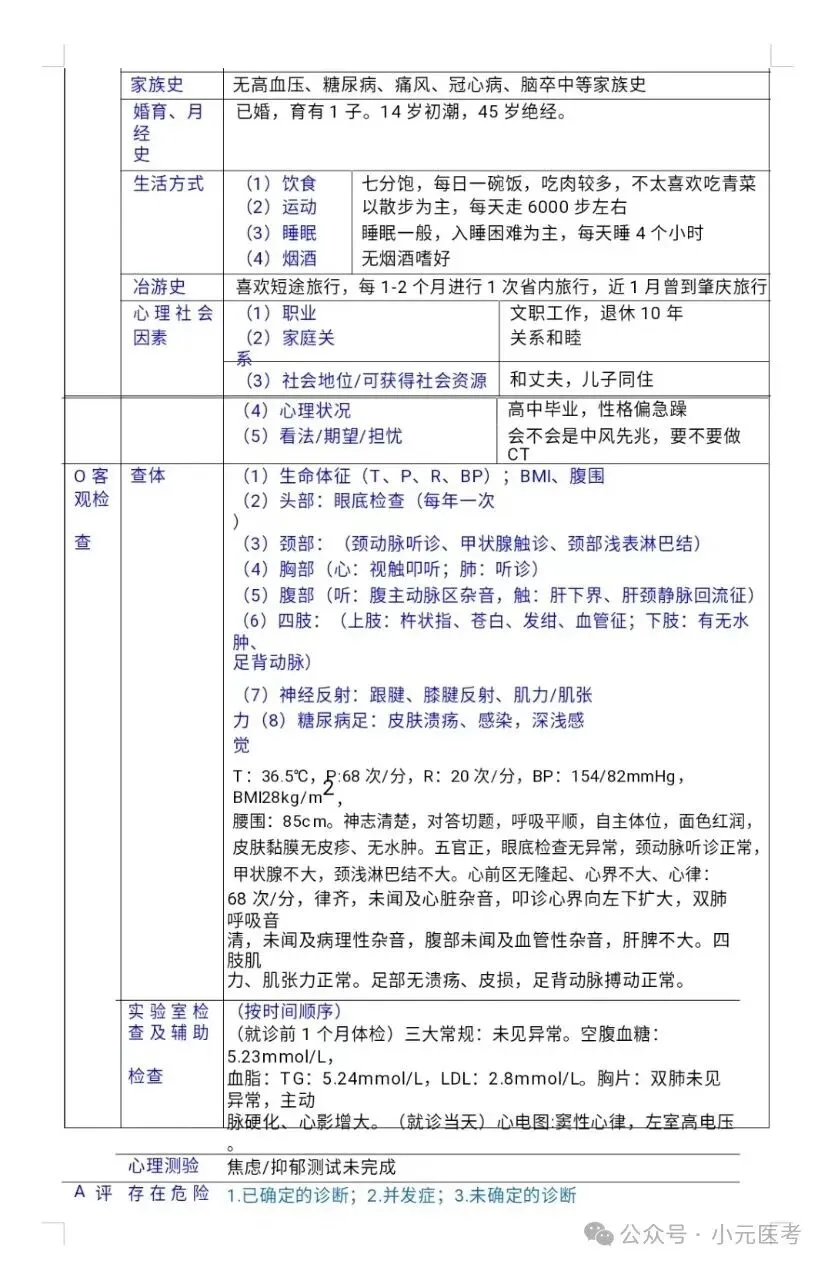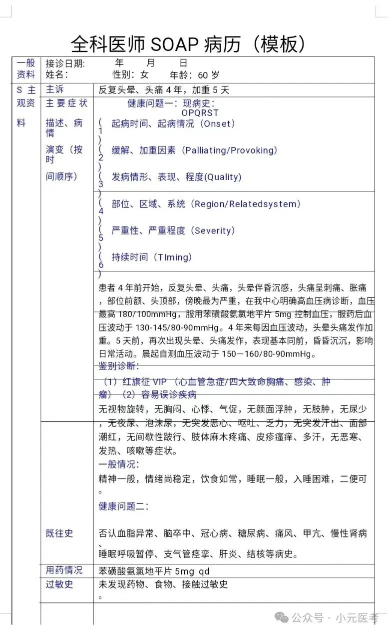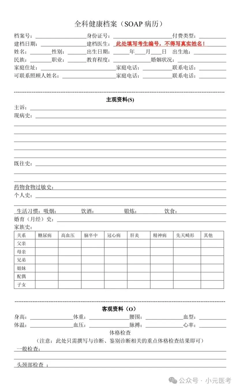 2.表头表头表头!姓名性别年龄学历职业有无医保,直接背下这个顺序,写也这样子写,问也这样子问,很关键,是大家写soap病历最容易忽略的点。关于性别:我记得之前当sp病人的时候,有一个考生在家庭关怀中直接问我你老婆身体怎么样(sp病人只可能找男生扮演,但他男女老少都有可能饰演),经过我的提醒他才知道我扮演的是一个女的,应该问我老公身体怎么样(话说的比较绕-)