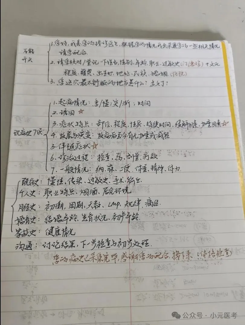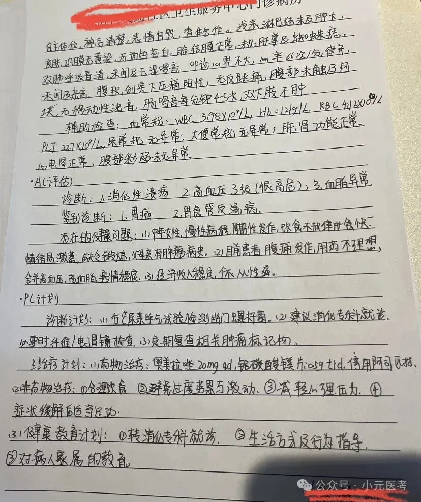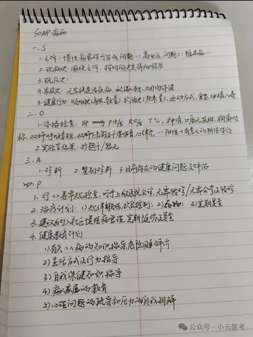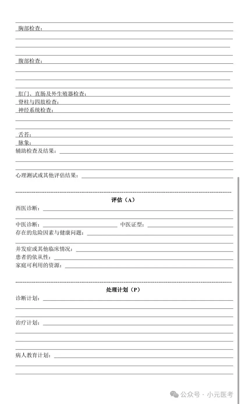 1.写soap病历的时候,所有标题都另起一行。让考官看的清清楚楚、明明白白,一看采分项都有了,才会再细看你的内容,甚至可能因为卷子太多而一看到另起一行醒目的采分点而直接给分,这样能弥补一些姐妹在问诊时候不详细忘记问了,但写的时候想起来的情况,相信我,编上去比空下来不写强。
