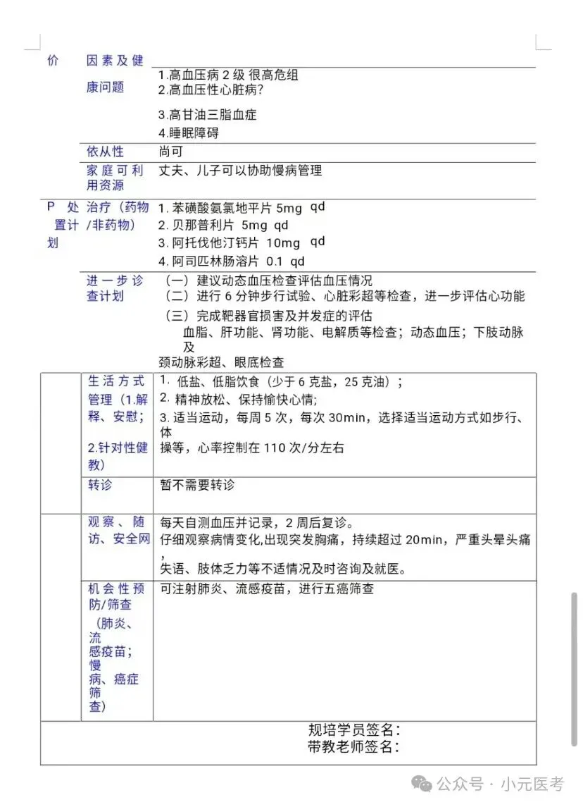 第二是治疗计划,里面同样分点:药物/非药物,这个就看大家平时的积累了,多看多背多掌握,非药物也就无非是些饮食/运动/健康管理/戒烟戒酒等等之前sp病人自己提及的不良习惯/改善关系等等。