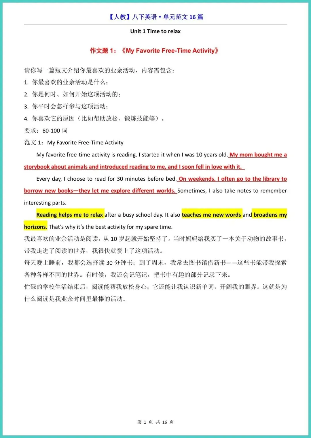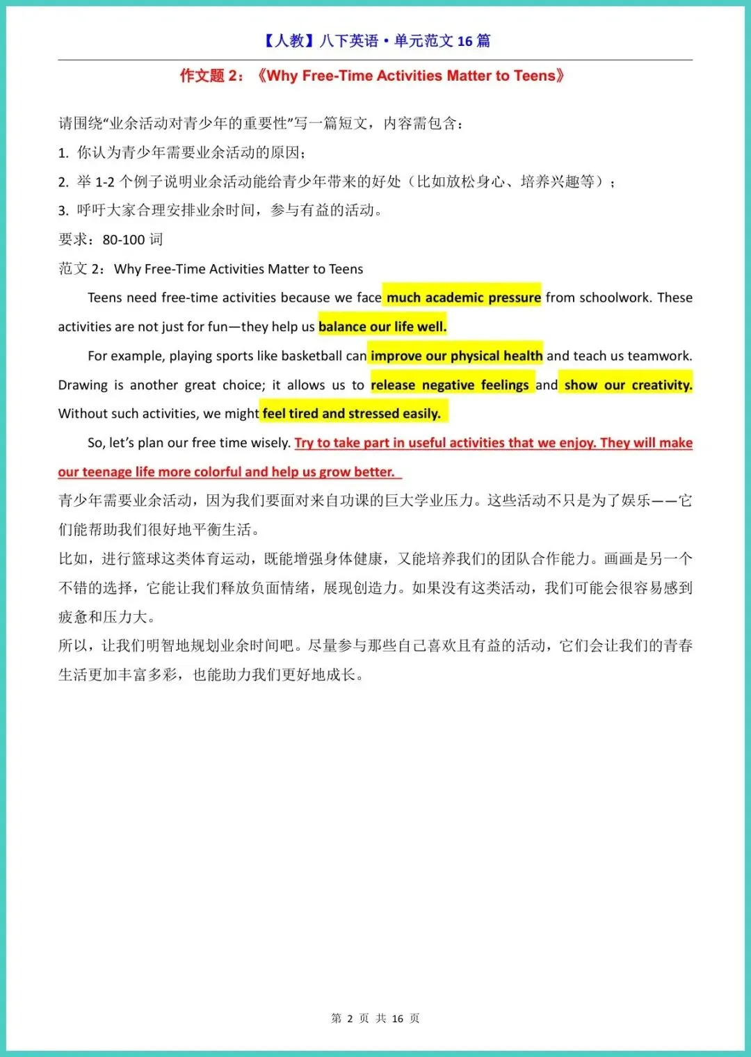 2026春人教版八年级下册英语作文范文集,共16页16篇,电子版高清可打印!涵盖单元主题、考试高频、热点话题,篇篇配中文思路点拨高级词句万能模板,让孩子先模仿再超越,20分钟搞定一篇高分作文,告别背模板却写不出的尴尬。期中、期末、中考提前练,写作提分看得见!需要的家长,立刻打印,让孩子今晚就动笔!