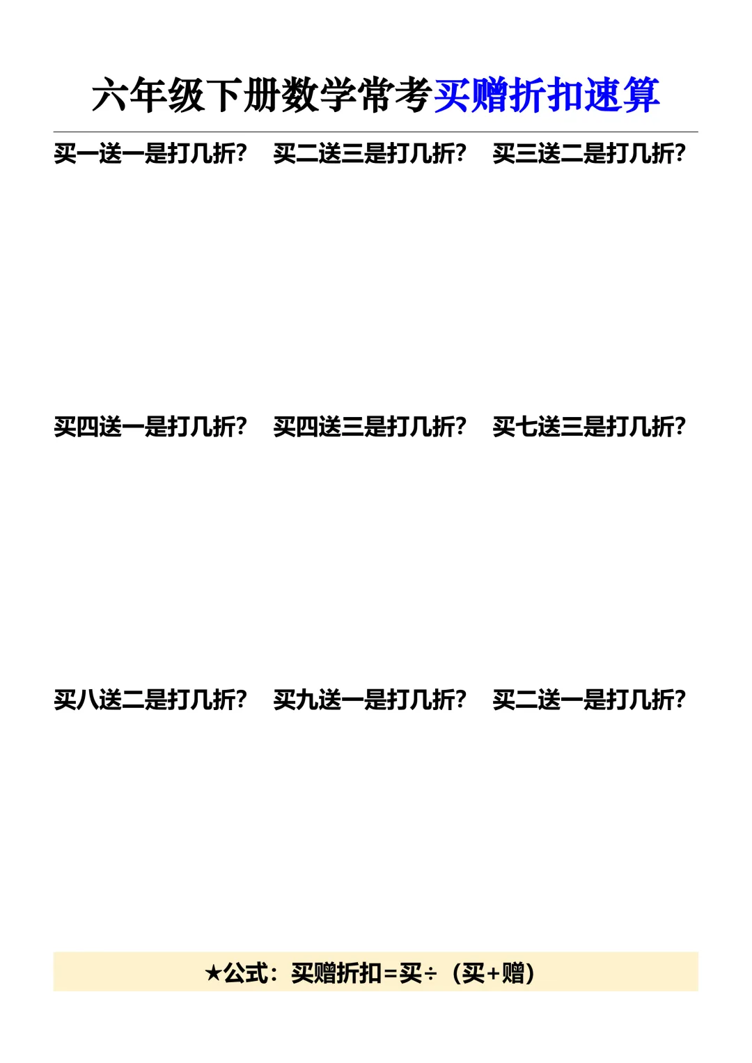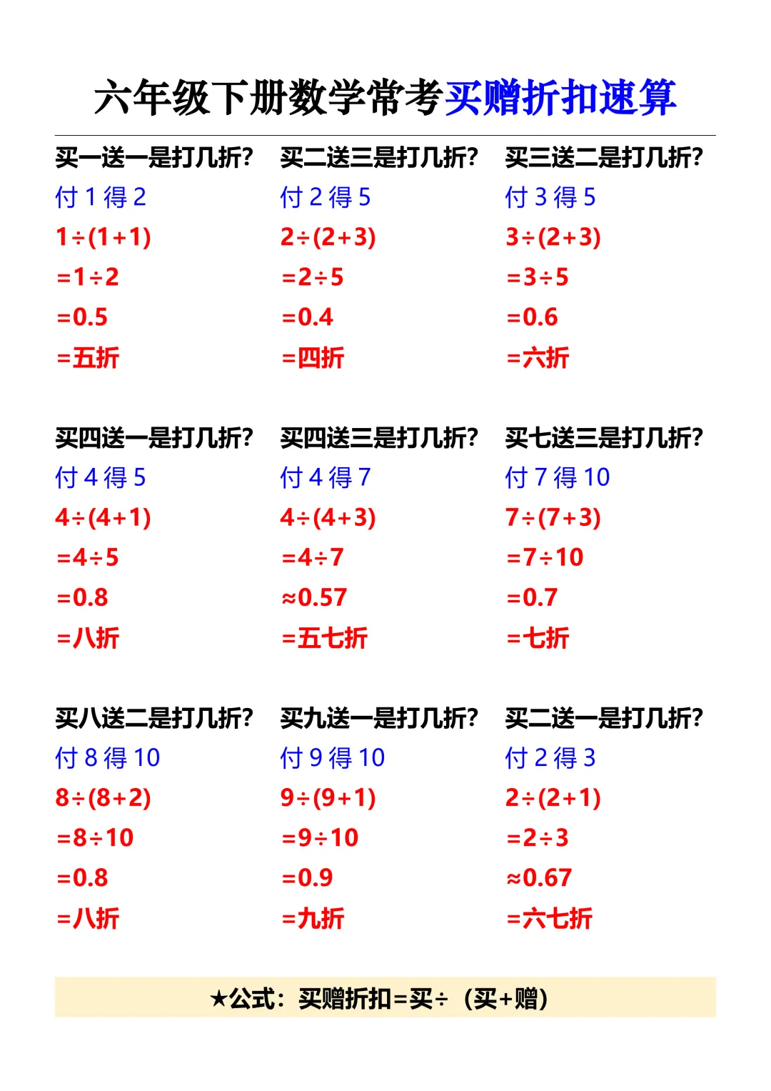 六年级下册数学:常考买赠折扣速算,电子版可打印 家长们,↑关↑我领资料 今天老师分享《六年级下册数学:常考买赠折扣速算》精选资料给家长,下载电子版打印给孩子记背练习! 提示:文末有完整电子版下载方式 (因篇幅有限,仅显示部分内容) 先加老师好友,方便接收完整资料 若已是好友(同头像),就不要重复加!(家长多,若没及时回复,请耐心等待) 每天150位+家长在领取!