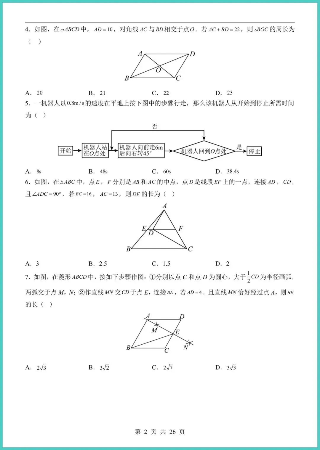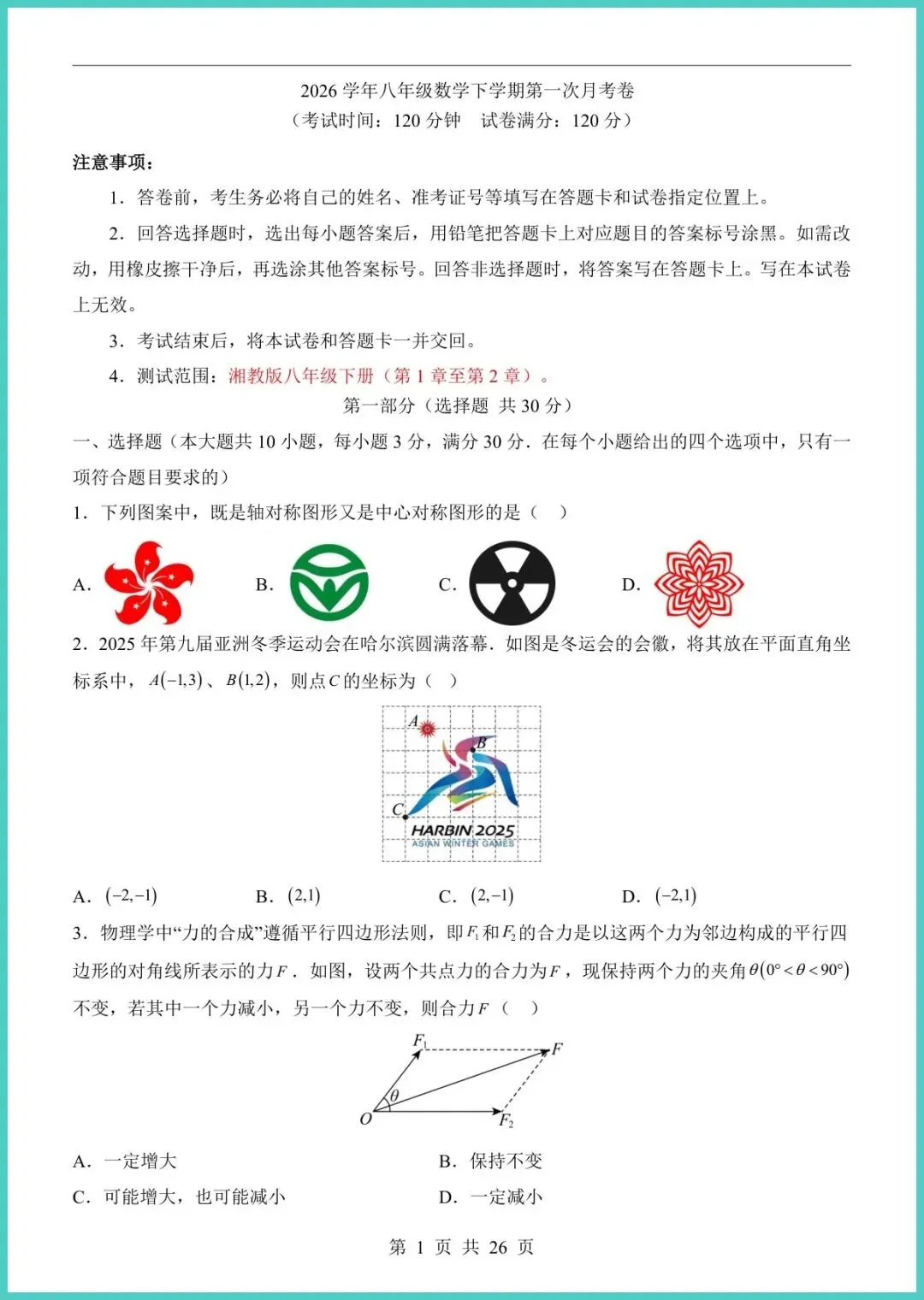 26年春湘教版八年级下册数学第1次月考卷,26页高清电子版,一键就能打!紧扣湘教进度,分基础闯关、易错警示、压轴挑战三大板块,每题配思路点拨+评分标准,让孩子提前熟悉月考题型,把薄弱点一网打尽。每天10分钟,两周见分亮,提分不熬夜!想让孩子第一次月考就稳拿高分?家长快把资料存起来,今晚打印,明天练起!