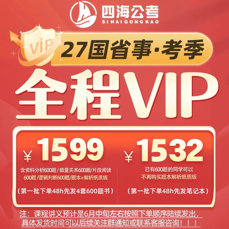 本轮27年笔试VIP课程正课从26年6月末至27年3月末,适合27国考、27省考联考、27事业单位联考考试,5月-6月将会在抖音直播讲解逻辑判断和片段阅读600题,该部分讲解的回放在APP中。