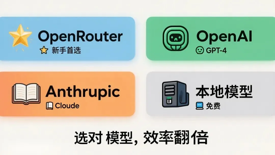 •OpenRouter(新手首选):一个API Key调用Claude、GPT等多种模型•OpenAI:如果你有GPT-4 API•Anthropic:如果你有Claude API•其他:根据你的需求选择