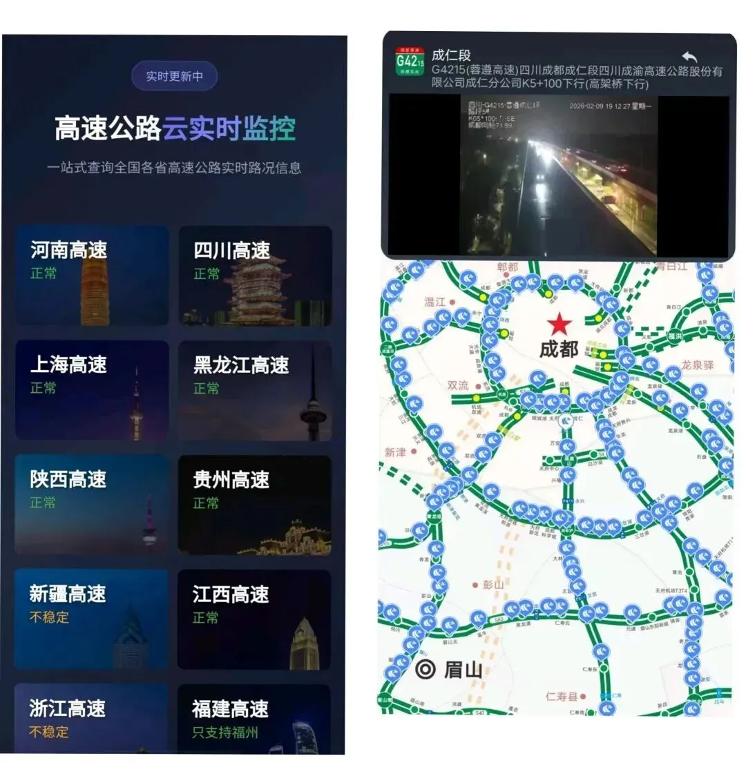 1. 实时画面监控:覆盖全国高速主线、收费站、服务区、隧道等关键路段,提供实景直播功能,点击地图上的摄像头图标,就能查看几秒前的实时画面,直观判断路段是否堵车、堵车严重程度,轻松区分“真堵”与“假堵”,避免盲目绕路或原地等待。