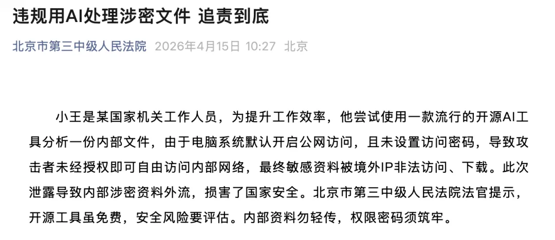 小王(化名)是国家机关工作人员,为提升工作效率,使用一款热门开源AI工具分析内部文件。因电脑默认开启公网访问且未设密码,攻击者轻易接入内部网络,敏感资料被境外IP非法下载,最终导致涉密信息外流。