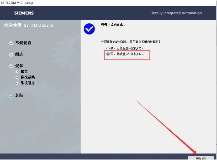 15. 安装成功,提示重启计算机,选择【否,稍后重启计算机(N)】,然后点击【关闭】。