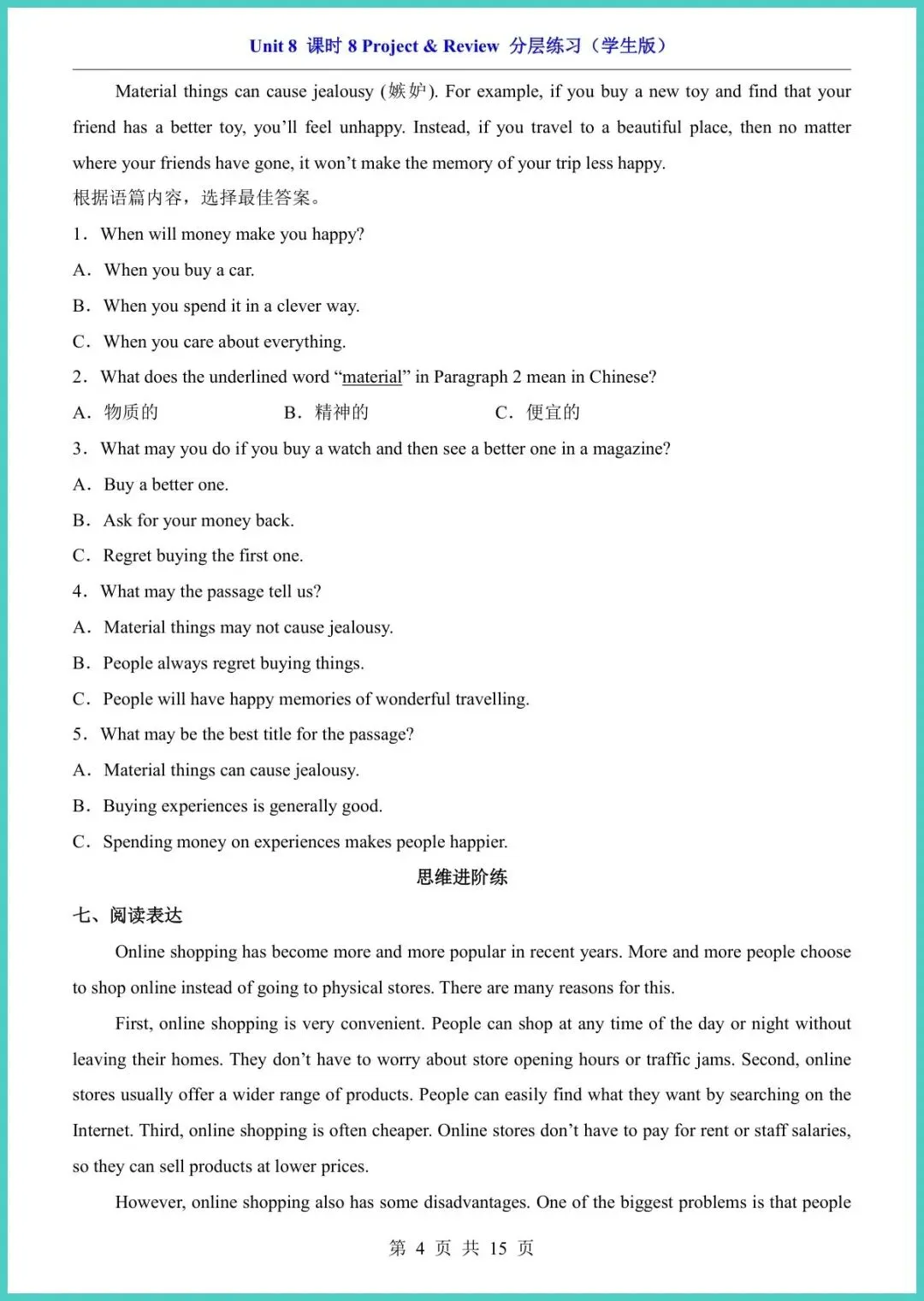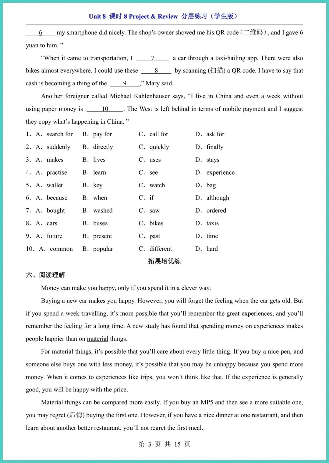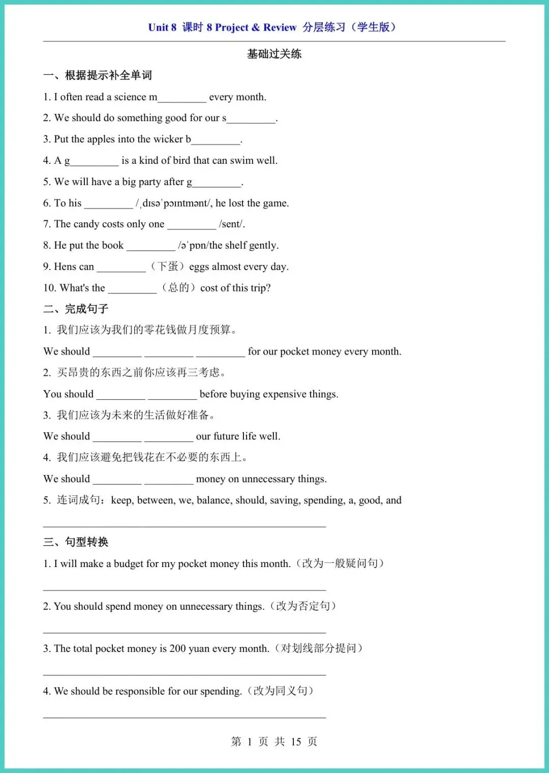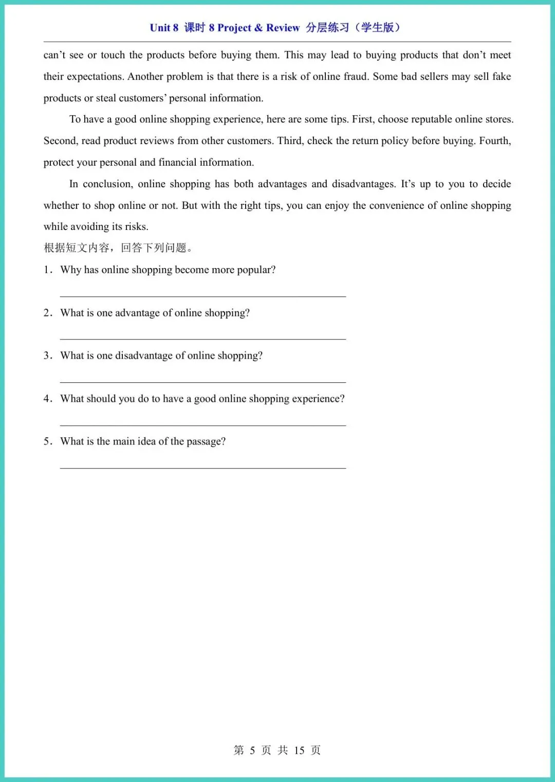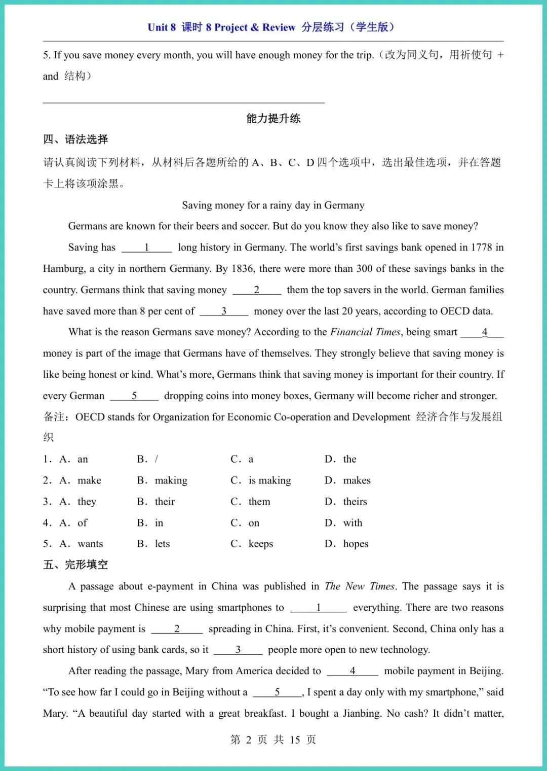 2026春仁爱版八年级下册英语Unit 8课时8分层练习,15页电子版,直接打印就能练!这套练习按“基础巩固—能力提升—拓展拔高”三级分层,词汇、句型、阅读、写作全覆盖,搭配中考真题变式,帮孩子把课堂漏洞一次补齐;答案带解析,家长陪读不抓瞎。想让孩子第八单元不丢分,现在就把这份练手资料打印出来,每天15分钟,轻松提分!需要的家长速存,错过等一年!