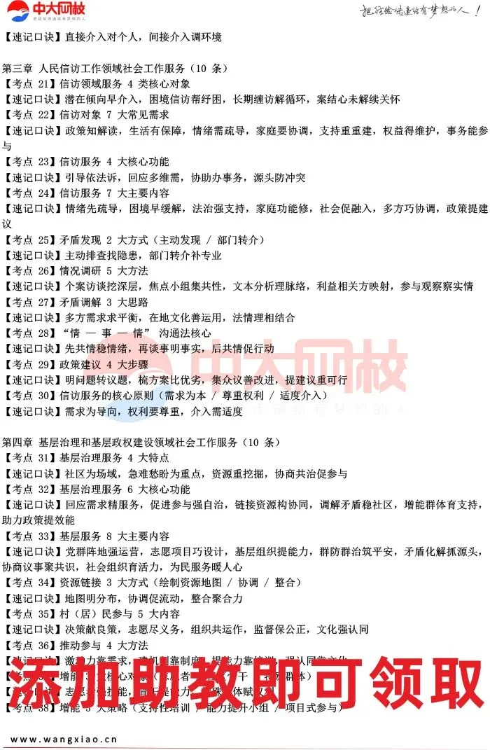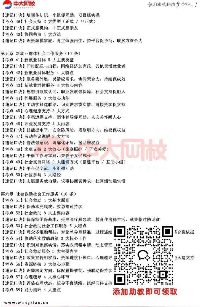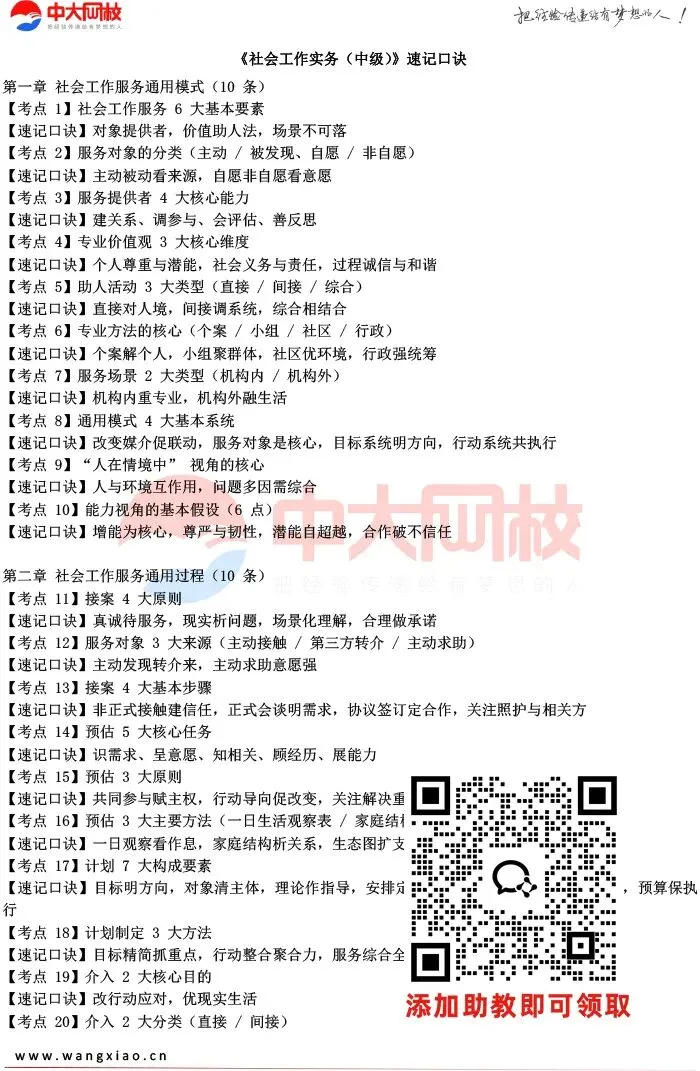 为方便大家打印背诵,完整版《中级社工实务160个速记口诀PDF》已整理完毕,添加助教老师微信,即可免费领取这份冲刺必备资料,助力大家考场从容作答,顺利通关2026社工考试!
