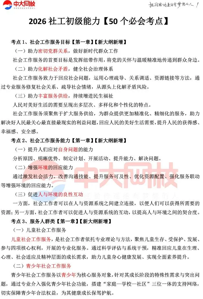 2026年社会工作师考试新版教材章节繁多、知识点庞杂,中大网校针对新版教材精心研发了各科目思维导图 、章节试题 、初中级各科目50个必会考点、新增考点必做题等资料,帮助考生掌握核心考点、提升答题技巧,实现高效备考,考生可添加助教老师微信咨询获取哦。