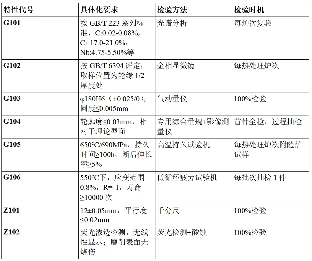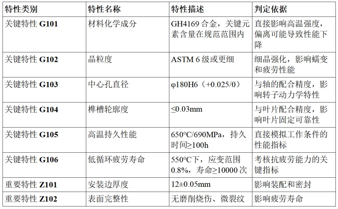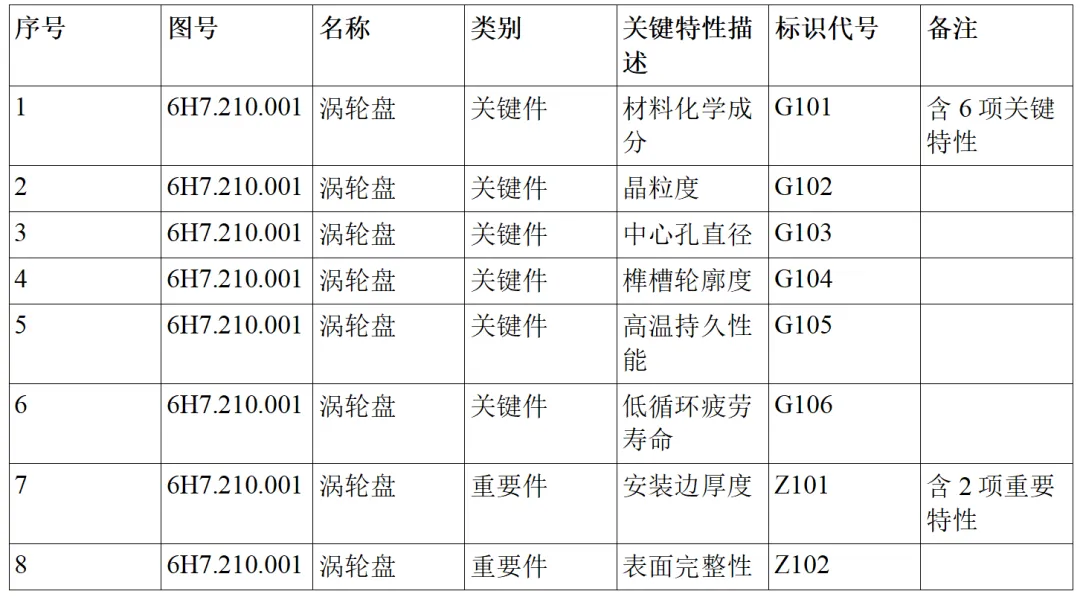 特性分析报告经设计、工艺、质量、材料等部门会签,总工程师批准后正式发布。报告明确了涡轮盘为关键件,包含6项关键特性、2项重要特性。