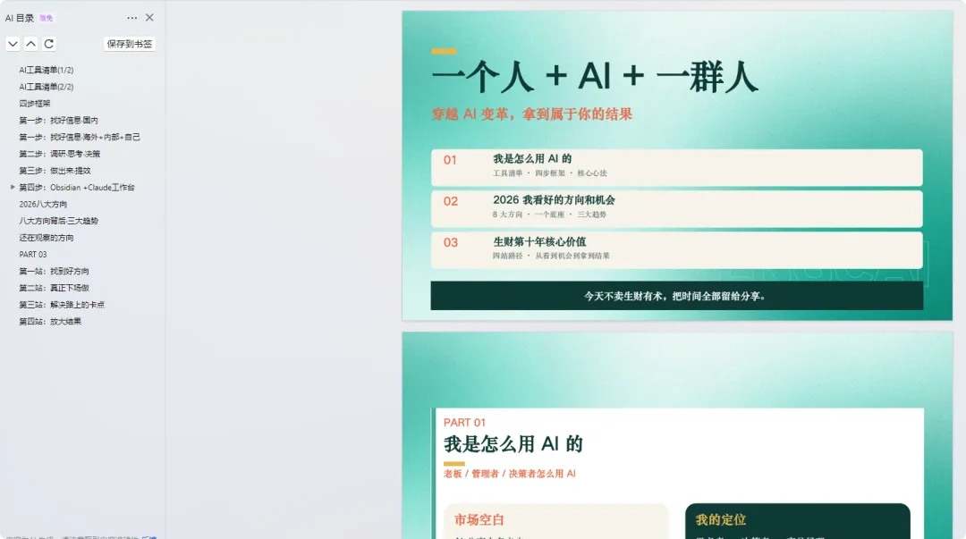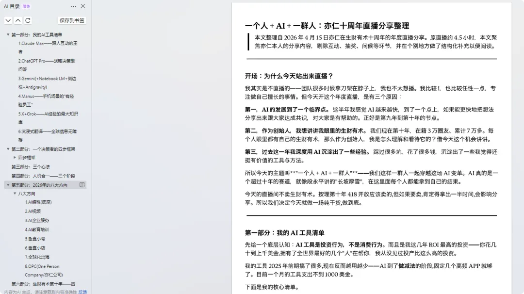 亦仁在生财有术十周年的分享,看了两份资料,一个是直播整理,一个是PPT,核心就讲了一件事:普通人在AI时代,怎么把事情做起来。