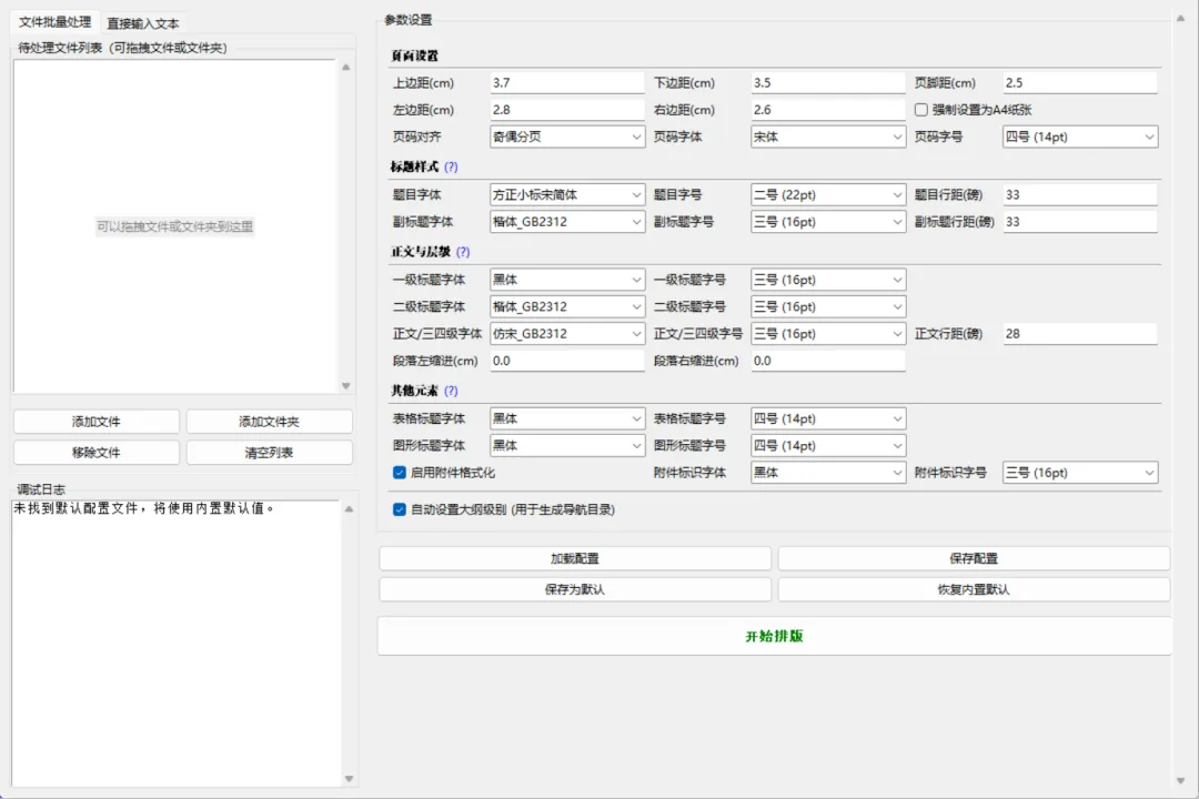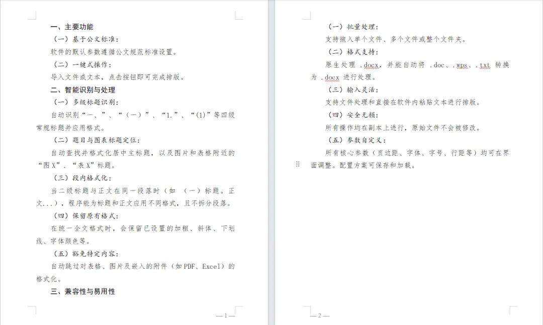 (一)批量处理:支持拖入单个文件、多个文件或整个文件夹。(二)格式支持:原生处理 .docx,并能自动将 .doc、.wps、.txt 转换为 .docx 进行处理。(三)输入灵活:支持文件处理和直接在软件内粘贴文本进行排版。(四)安全无损:所有操作均在副本上进行,原始文件不会被修改。(五)参数自定义:所有核心参数(页边距、字体、字号、行距等)均可在界面调整。配置方案可保存和加载。