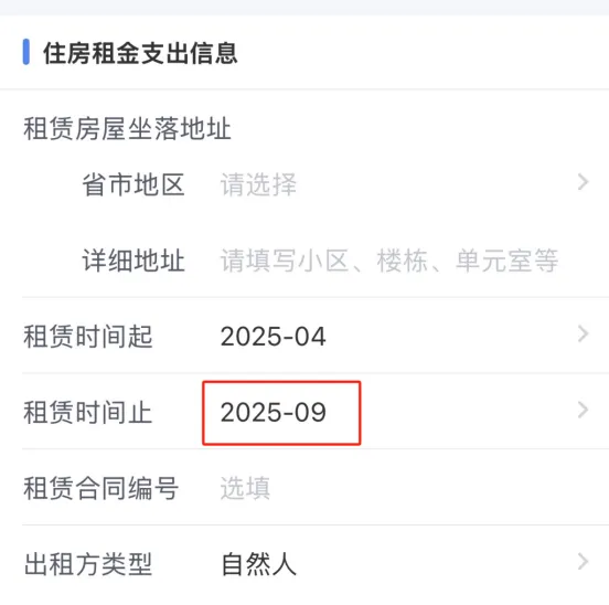 举例:小李2025年4月租了一套房,租期到当年9月30日,但因工作地变更,9月初他又在新工作地附近租了一套房,这样一来,9月份两套房子就都在租期之内了。这种情况下,小李在填报“住房租金专项附加扣除信息”时,就可以保持之前的信息不变,新的住房“租赁时间起”填写为2025年10月,这样两处房子的租房起止时间就不会重叠了。