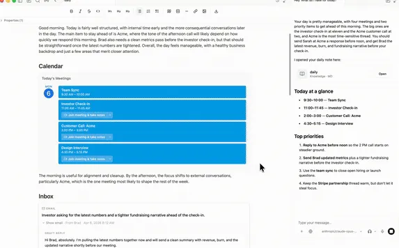 你猜怎么着?大概 15 秒后,它直接给我吐出了一页清晰的 brief。里面不仅有上次会议的 3 个决策点,还列出了 Alex 提的 2 个开放问题,甚至精准地找到了我们上周邮件里聊过的留存方案细节。