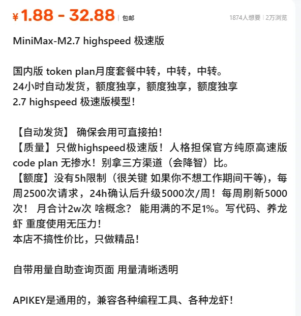 我目前用的就是中转的MiniMax 2.7 Ultra套餐,用了一个多月了,整体使用下来,感觉效果还是非常不错的,价格也特别实惠。