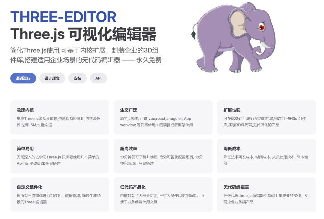 今天要分享的这个开源项目:Three-Editor——一个基于Three.js的3D低代码编辑器,把复杂的3D编程变成了“拖拖拽拽”就能完成的工作。