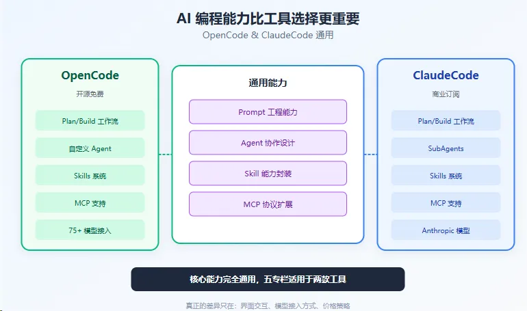 而事实是:OpenCode 和 ClaudeCode 的绝大部分能力是完全通用的。
