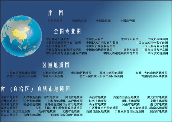 本次全中国地质图集来源于中国地质科学院地质研究所,图集由世界地质图、亚洲地质图、全国各专题图和分省/自治区/直辖市等四类图幅组成,共56幅图,全部文件还有图例、地质说明文件等一共183张图片。