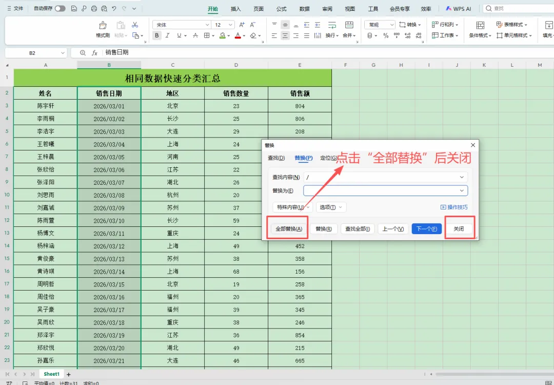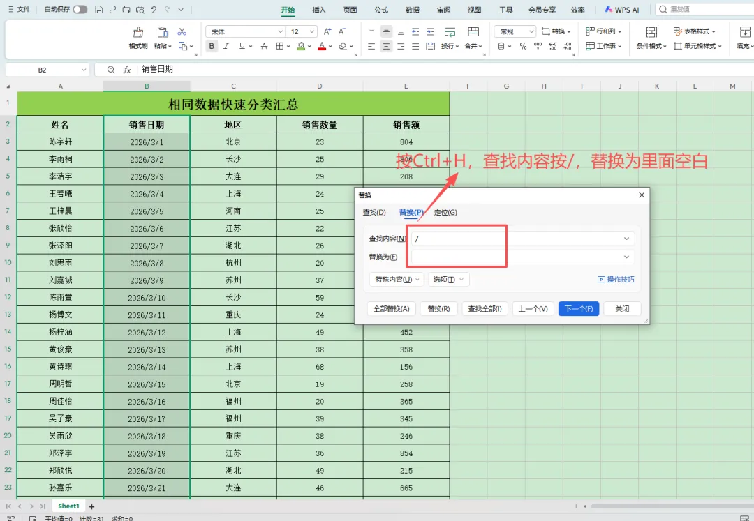 Excel中如何快速查找替换 Excel里最基础、最常用、最实用的功能之一,查找替换!学会后让你效率翻倍(详细教程如下)。 第一步:首先选中日期这一列。 第二步:按Ctrl+H键打开替换,查找内容输入斜杠符号,替换为里面什么都不输入。 第三步:点击全部替换,确定,关闭对话框。 这样就搞定了,是不是很简单,赶快跟着视频学习吧! 已关注 关注 重播 分享 赞 视频详情