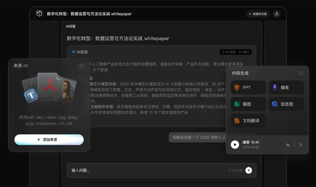 区别于传统聊天机器人与笔记软件,有道宝库支持上传文档构建专属知识库,基于资料对话问答,并可一键生成PPT、思维导图、播客脚本等内容,帮助用户在30分钟内快速吃透陌生领域,高效掌握专业知识。