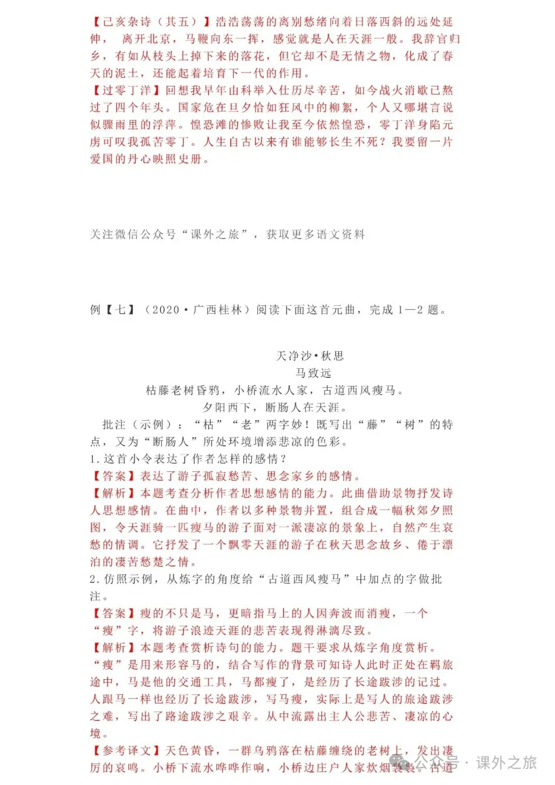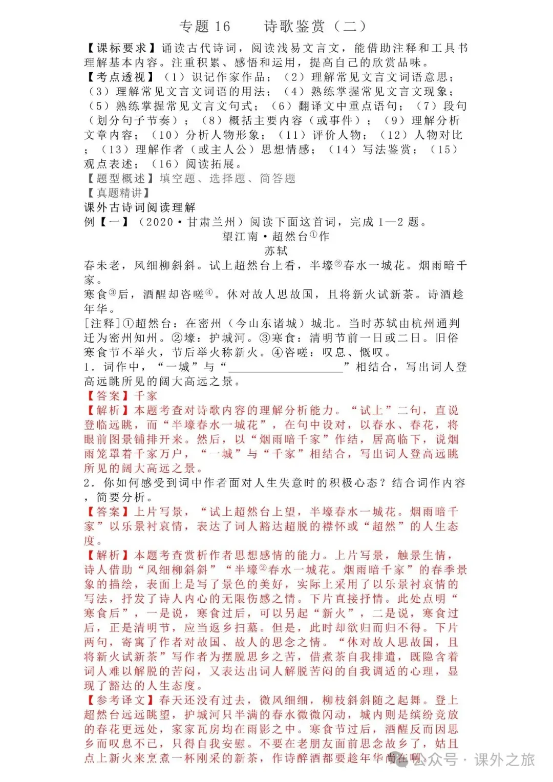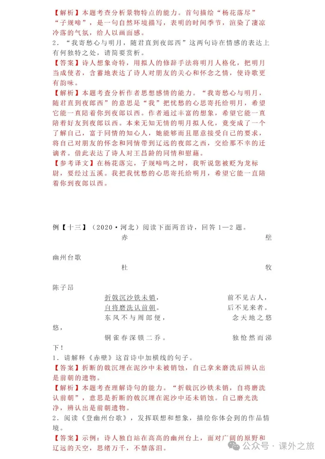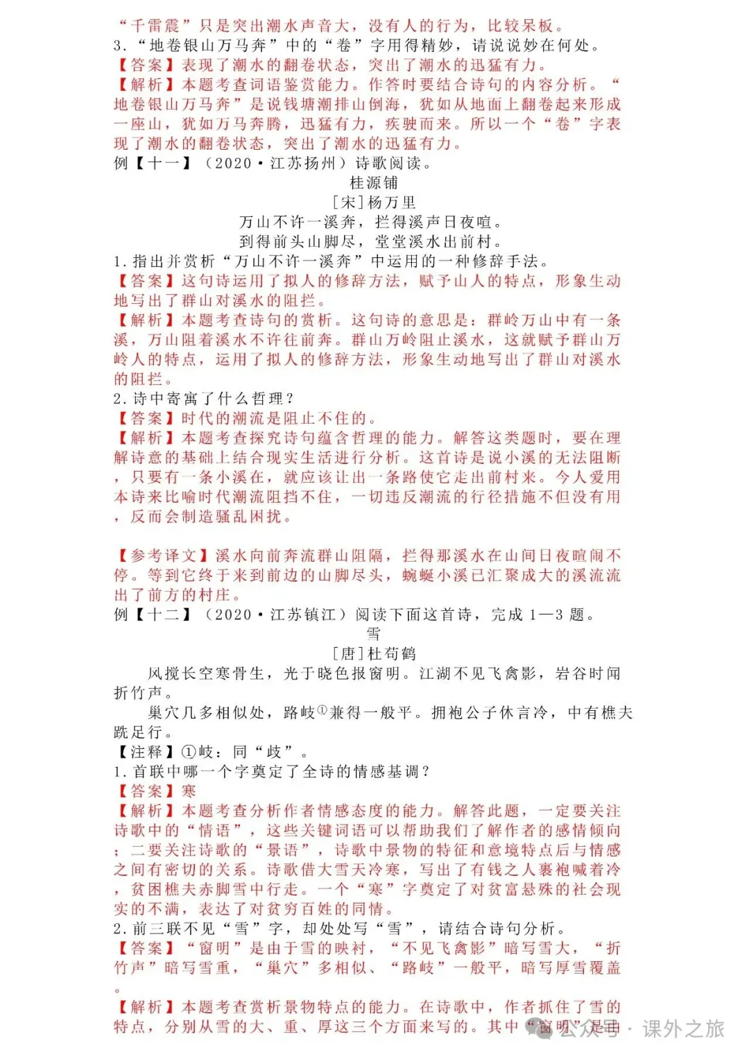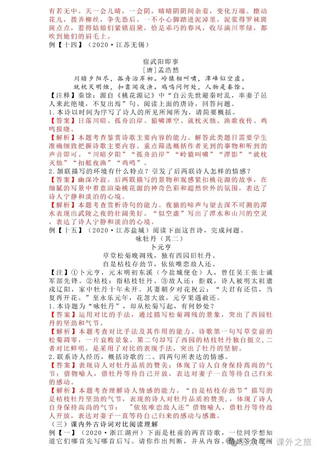 中考语文专项训练 专题16.诗歌鉴赏丨可下载 冬冬老师今天给大家整理了中考语文专项训练 专题16.诗歌鉴赏,请各位家长打印给孩子练练,更好的巩固所学的知识点!领取电子版和答案请拉到文末点我打印,5分一页,包邮到家!专题1.辨析和修改病句专题2.词语(成语)的理解与运用专题3.诗文名句背诵默写专题4.字音与字形写专题5.文学与文化常识专题6.修辞专题7.仿写专题8.标点符号专题9.汉字书写、汉字常识和书法鉴赏专题10.表达简明•连贯•得体专题11.仿积累与运用•语段阅读综合考查专题12.信息提取与概括专题13.对联专题14.文言文课内及课内对比阅读专题15.文言文课外及课内外对比阅读(因篇幅有限仅展示其中部分)(一)(篇幅有限,仅展示部分,下载含答案) (二)(篇幅有限,仅展示部分,下载含答案) -资源免费获取方式- 👇①扫码添加老师微信👇 进群可获取每日最新资源 👇②关注课外学苑公众号👇 回复关键词【中考复习】👇③分享文章到微信朋友圈👇扫下方二维码保存下载