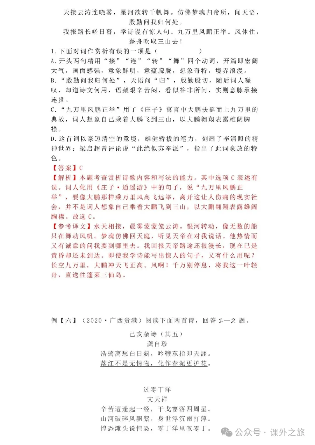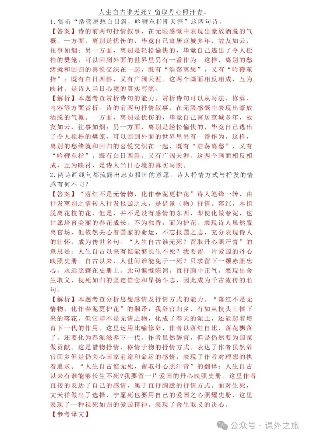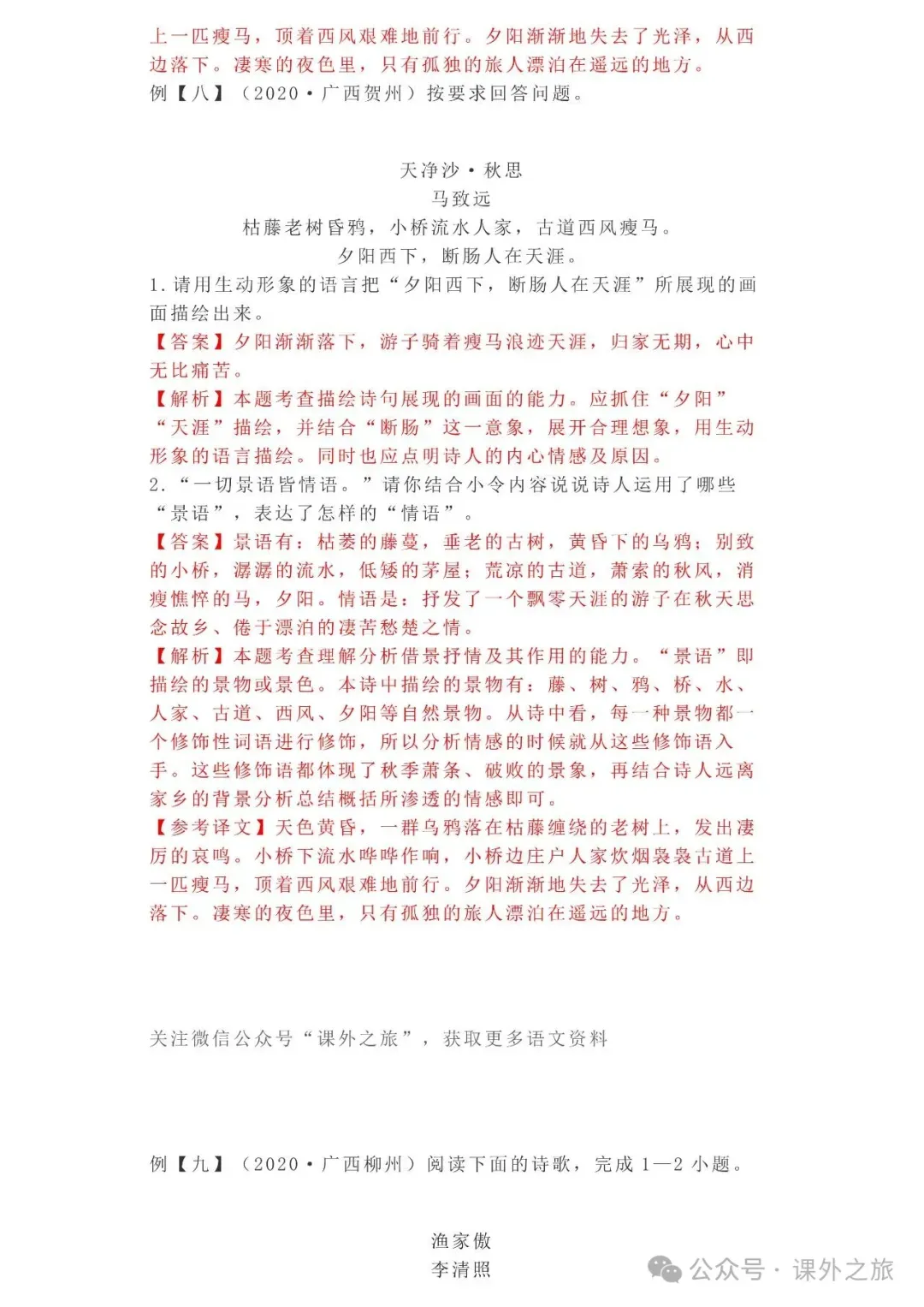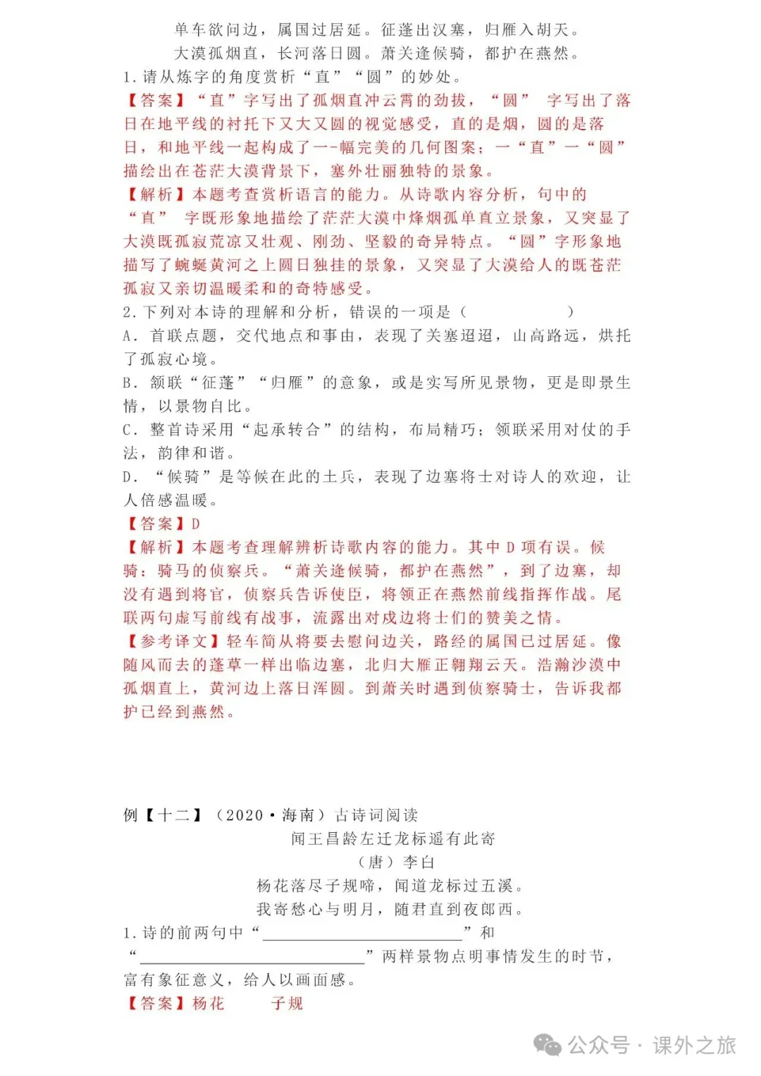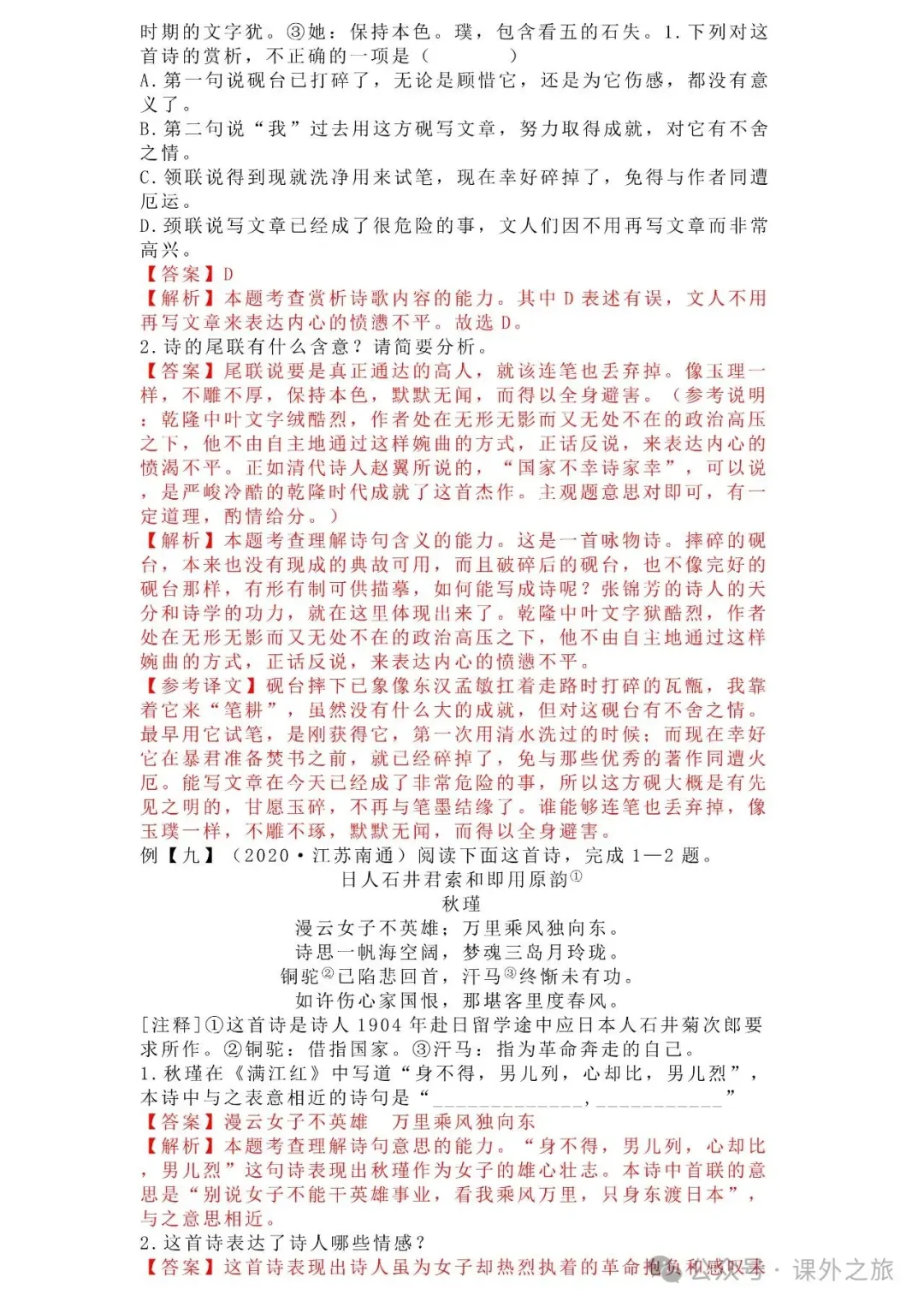 中考语文专项训练 专题16.诗歌鉴赏丨可下载 冬冬老师今天给大家整理了中考语文专项训练 专题16.诗歌鉴赏,请各位家长打印给孩子练练,更好的巩固所学的知识点!领取电子版和答案请拉到文末点我打印,5分一页,包邮到家!专题1.辨析和修改病句专题2.词语(成语)的理解与运用专题3.诗文名句背诵默写专题4.字音与字形写专题5.文学与文化常识专题6.修辞专题7.仿写专题8.标点符号专题9.汉字书写、汉字常识和书法鉴赏专题10.表达简明•连贯•得体专题11.仿积累与运用•语段阅读综合考查专题12.信息提取与概括专题13.对联专题14.文言文课内及课内对比阅读专题15.文言文课外及课内外对比阅读(因篇幅有限仅展示其中部分)(一)(篇幅有限,仅展示部分,下载含答案) (二)(篇幅有限,仅展示部分,下载含答案) -资源免费获取方式- 👇①扫码添加老师微信👇 进群可获取每日最新资源 👇②关注课外学苑公众号👇 回复关键词【中考复习】👇③分享文章到微信朋友圈👇扫下方二维码保存下载