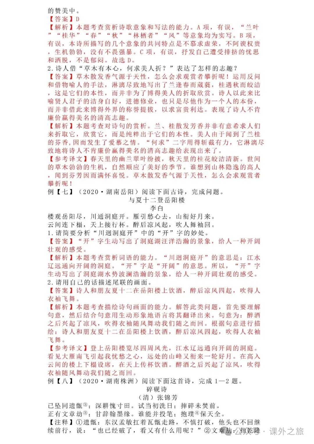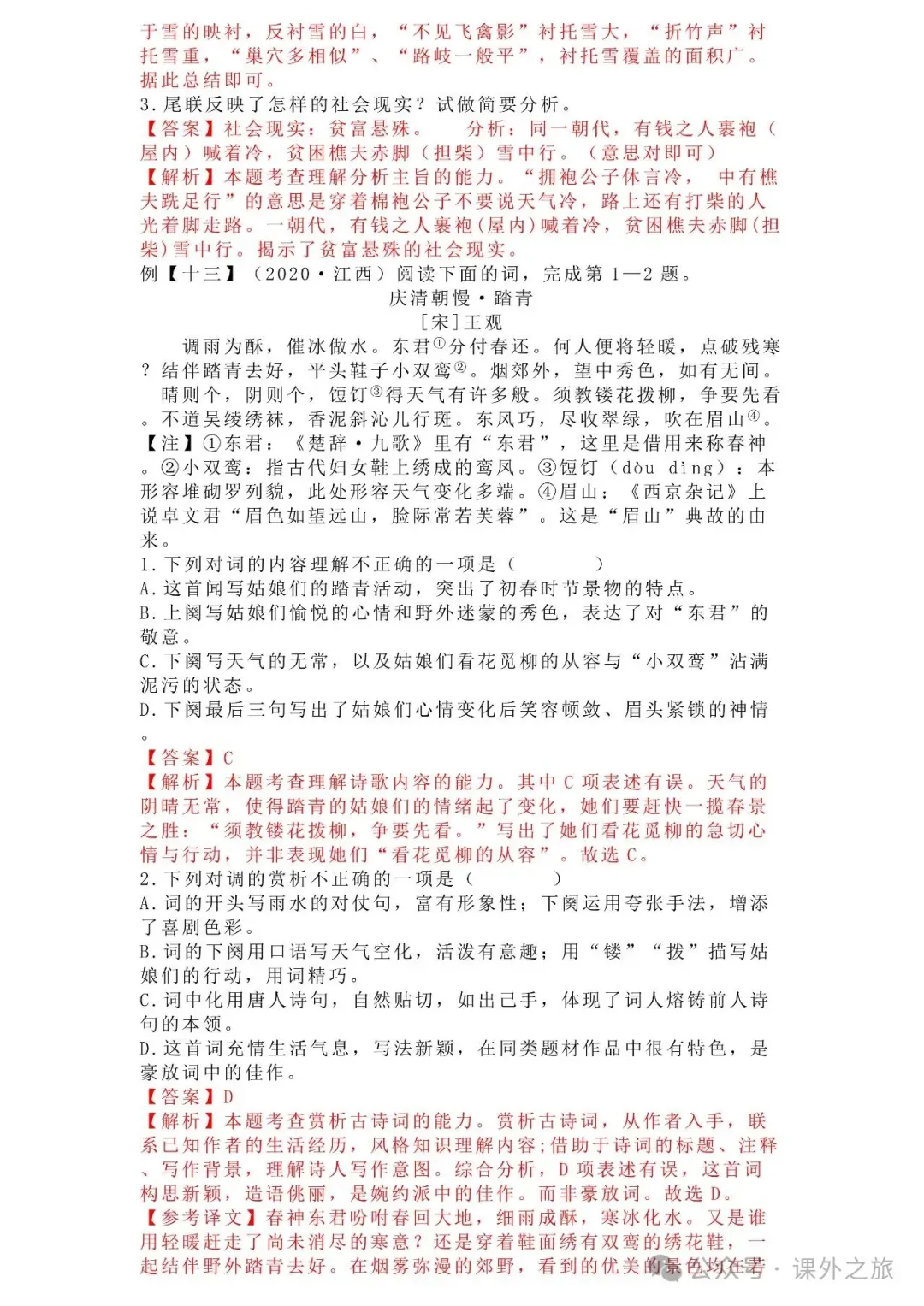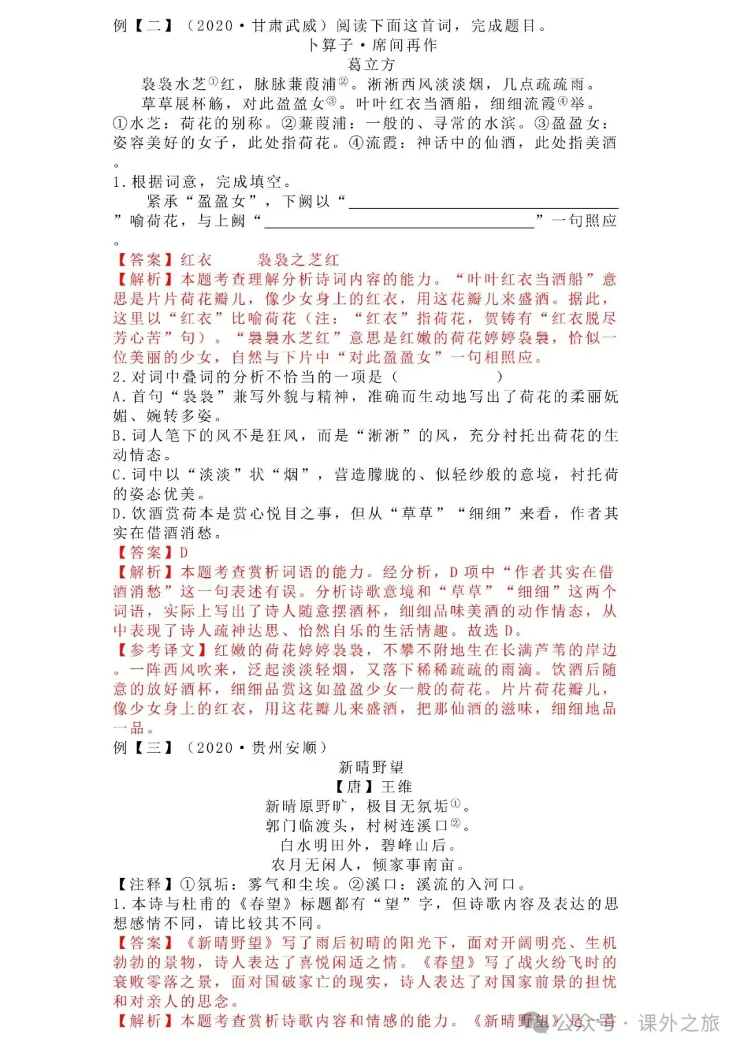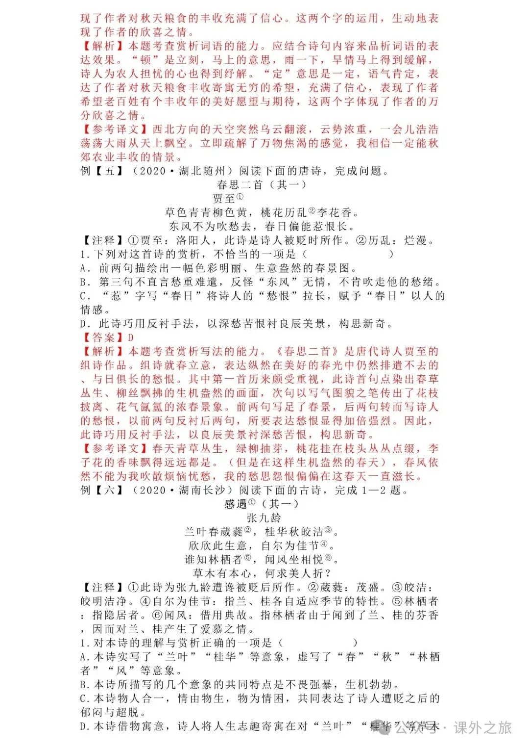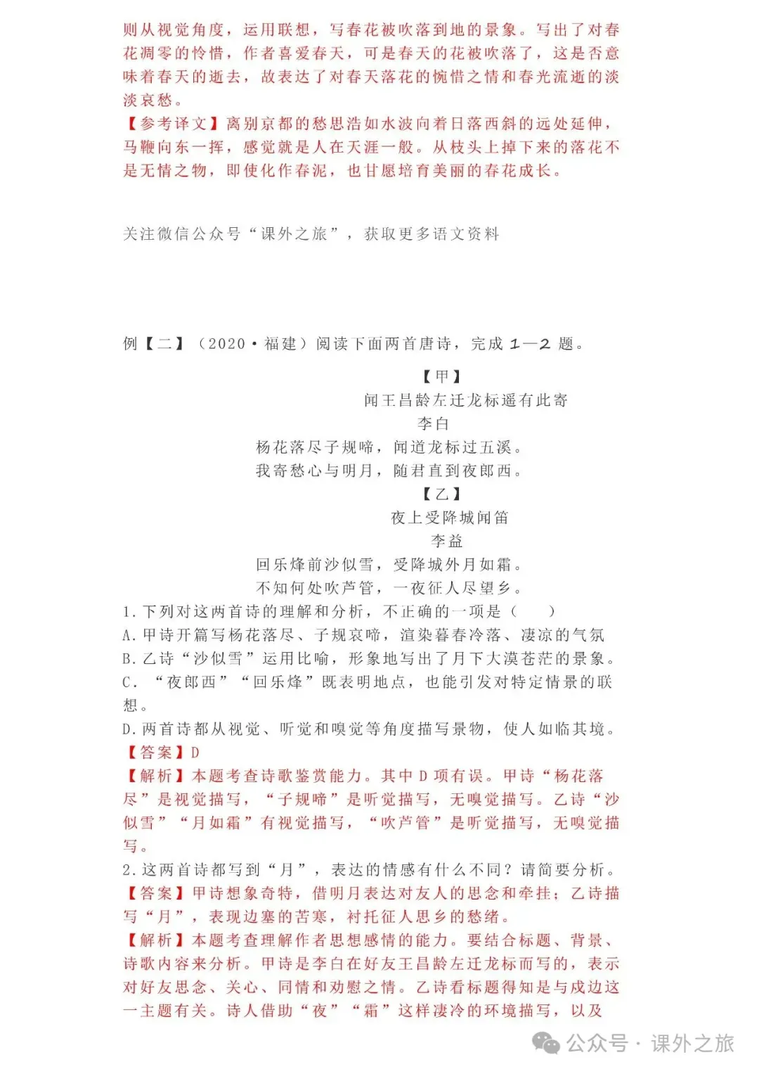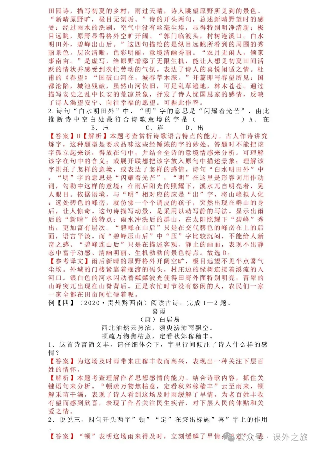 中考语文专项训练 专题16.诗歌鉴赏丨可下载 冬冬老师今天给大家整理了中考语文专项训练 专题16.诗歌鉴赏,请各位家长打印给孩子练练,更好的巩固所学的知识点!领取电子版和答案请拉到文末点我打印,5分一页,包邮到家!专题1.辨析和修改病句专题2.词语(成语)的理解与运用专题3.诗文名句背诵默写专题4.字音与字形写专题5.文学与文化常识专题6.修辞专题7.仿写专题8.标点符号专题9.汉字书写、汉字常识和书法鉴赏专题10.表达简明•连贯•得体专题11.仿积累与运用•语段阅读综合考查专题12.信息提取与概括专题13.对联专题14.文言文课内及课内对比阅读专题15.文言文课外及课内外对比阅读(因篇幅有限仅展示其中部分)(一)(篇幅有限,仅展示部分,下载含答案) (二)(篇幅有限,仅展示部分,下载含答案) -资源免费获取方式- 👇①扫码添加老师微信👇 进群可获取每日最新资源 👇②关注课外学苑公众号👇 回复关键词【中考复习】👇③分享文章到微信朋友圈👇扫下方二维码保存下载