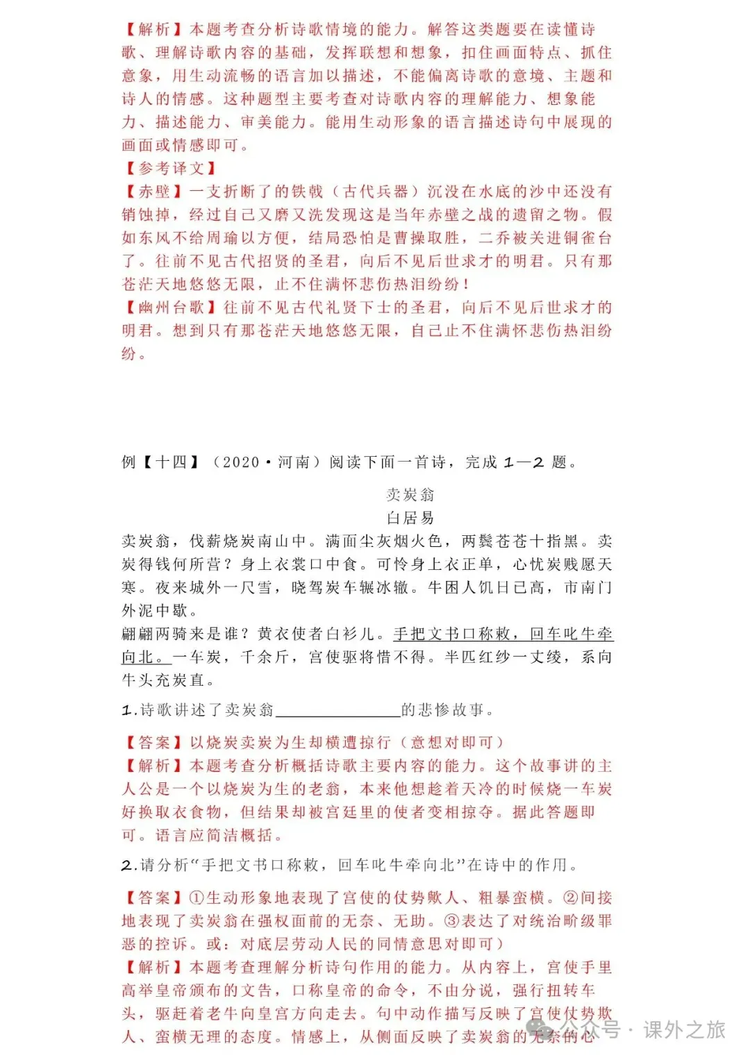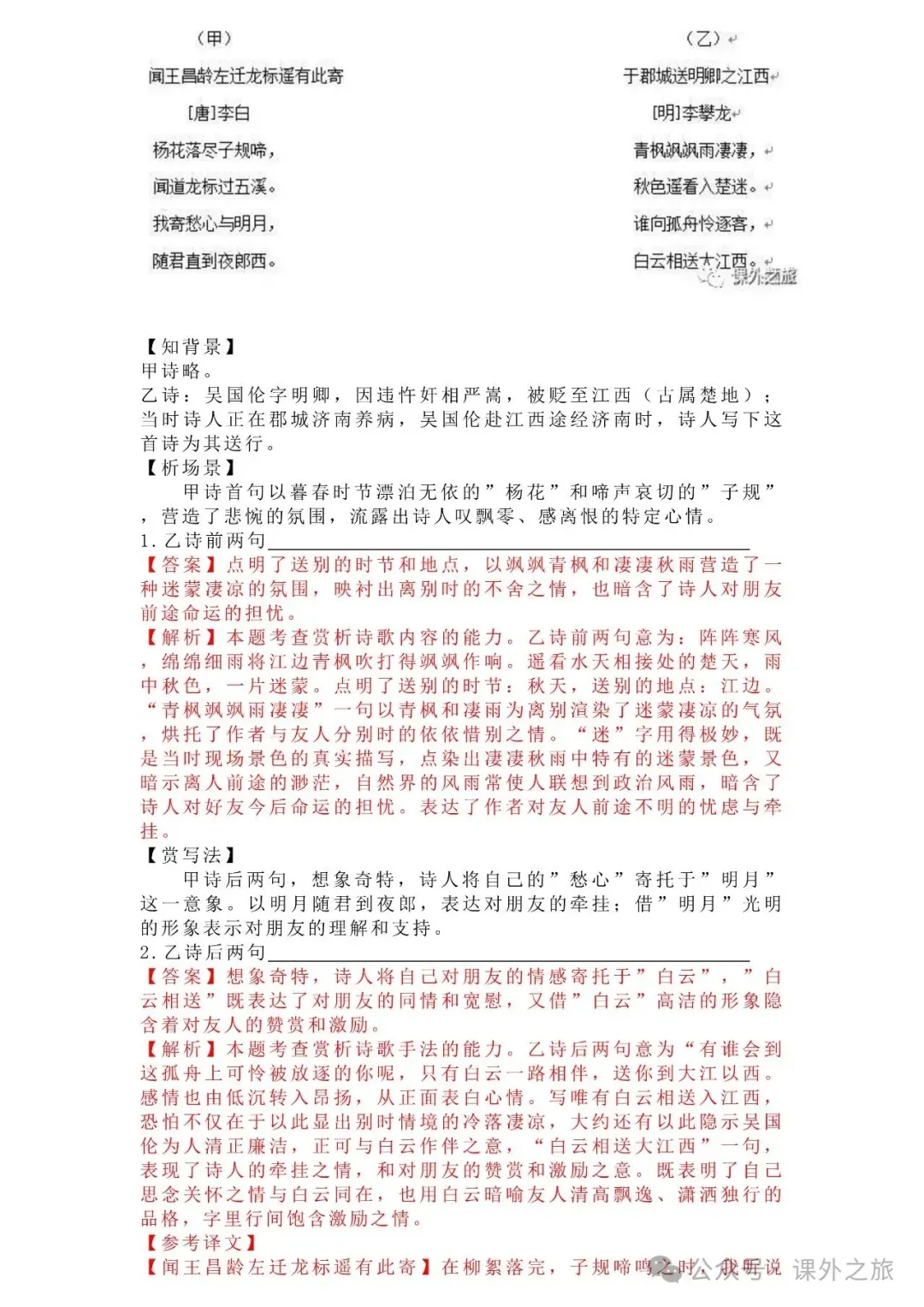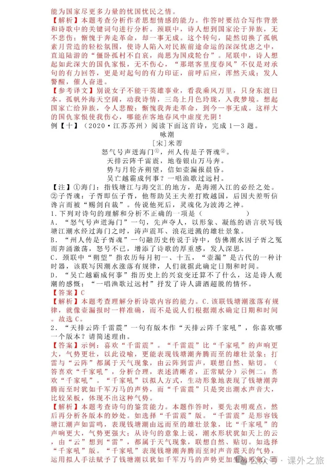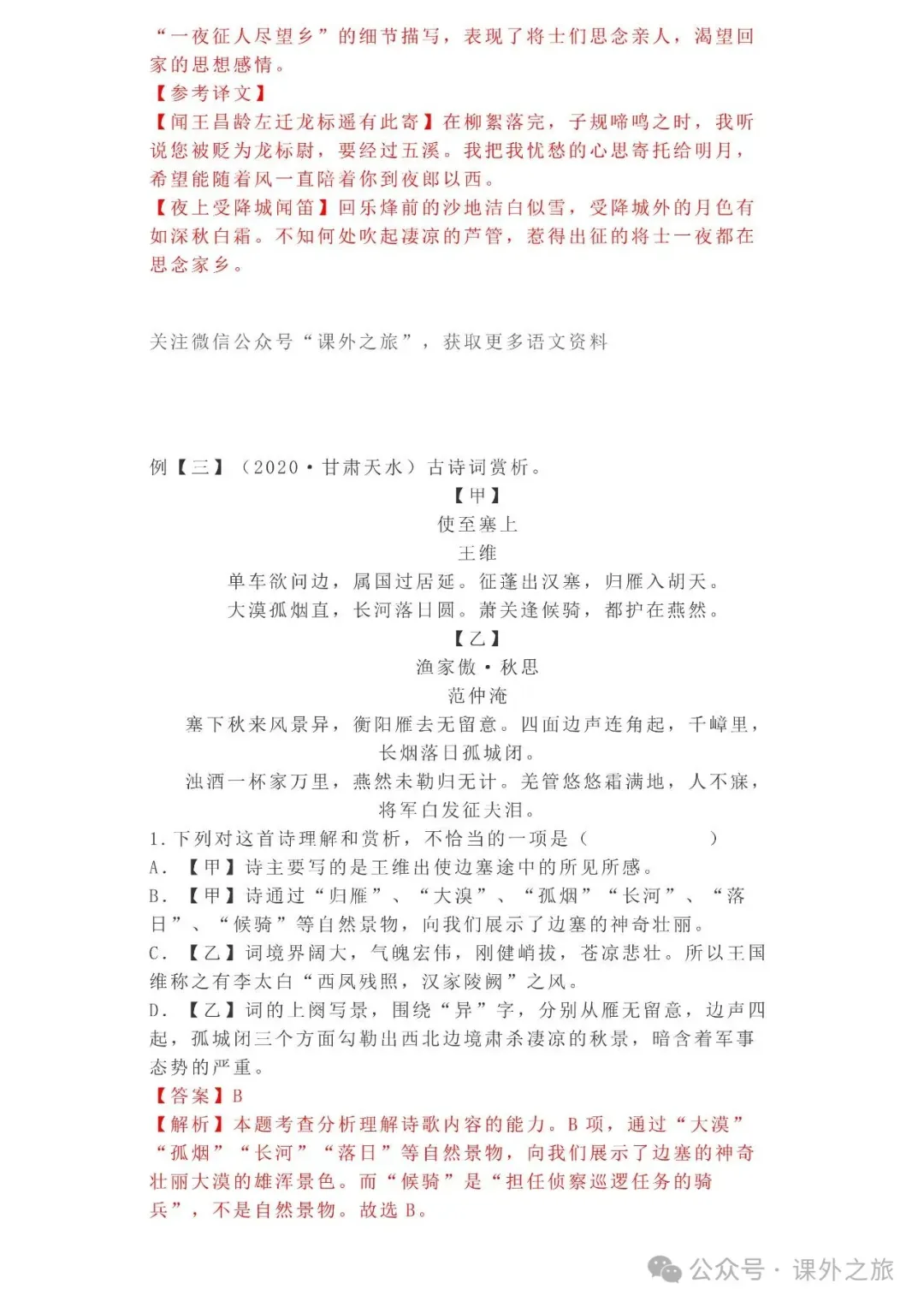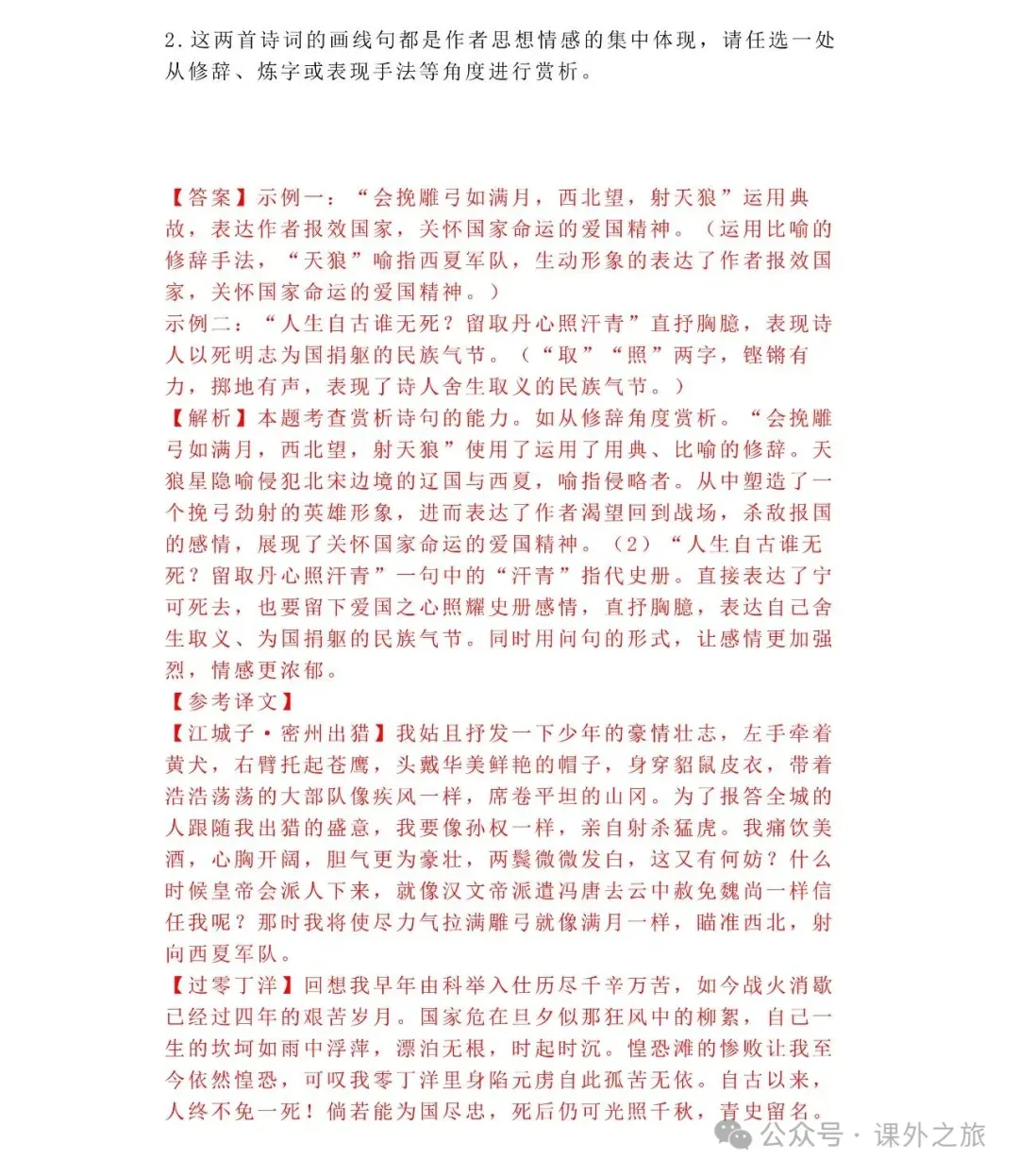 中考语文专项训练 专题16.诗歌鉴赏丨可下载 冬冬老师今天给大家整理了中考语文专项训练 专题16.诗歌鉴赏,请各位家长打印给孩子练练,更好的巩固所学的知识点!领取电子版和答案请拉到文末点我打印,5分一页,包邮到家!专题1.辨析和修改病句专题2.词语(成语)的理解与运用专题3.诗文名句背诵默写专题4.字音与字形写专题5.文学与文化常识专题6.修辞专题7.仿写专题8.标点符号专题9.汉字书写、汉字常识和书法鉴赏专题10.表达简明•连贯•得体专题11.仿积累与运用•语段阅读综合考查专题12.信息提取与概括专题13.对联专题14.文言文课内及课内对比阅读专题15.文言文课外及课内外对比阅读(因篇幅有限仅展示其中部分)(一)(篇幅有限,仅展示部分,下载含答案) (二)(篇幅有限,仅展示部分,下载含答案) -资源免费获取方式- 👇①扫码添加老师微信👇 进群可获取每日最新资源 👇②关注课外学苑公众号👇 回复关键词【中考复习】👇③分享文章到微信朋友圈👇扫下方二维码保存下载