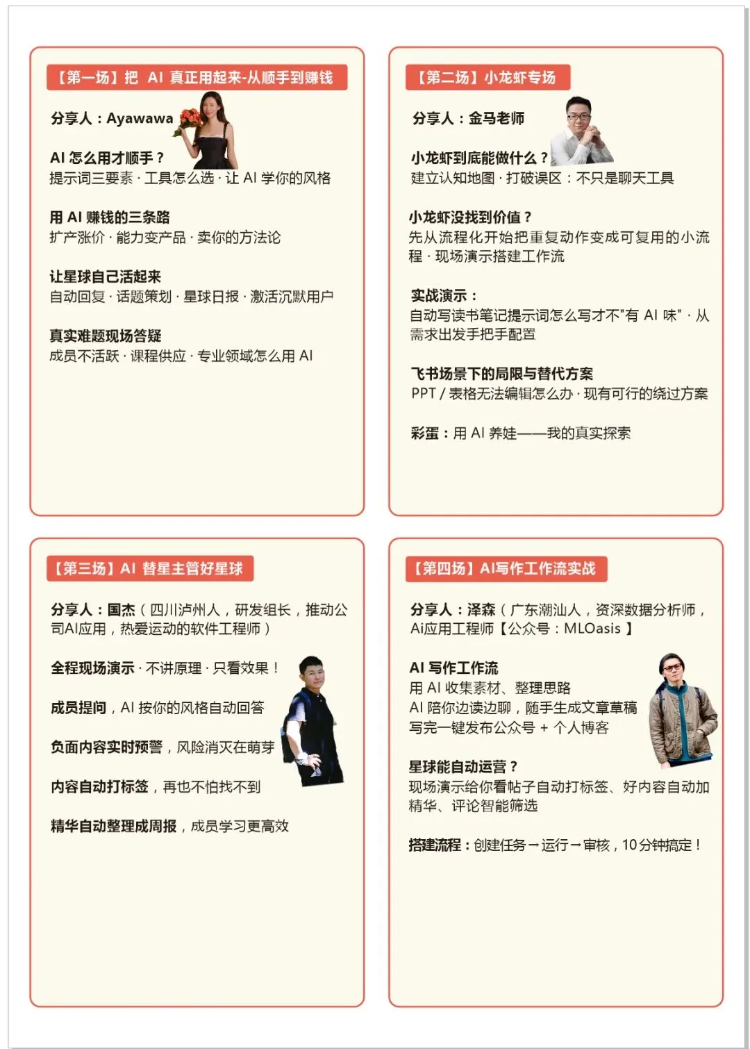 好的,谢谢你看我BB。今天就说到这儿,我去打工了。马上要去知识星球@上海星主AI交流会了,会有40位头部星主参加,4位分享嘉宾,分享AI,分享大纲👇