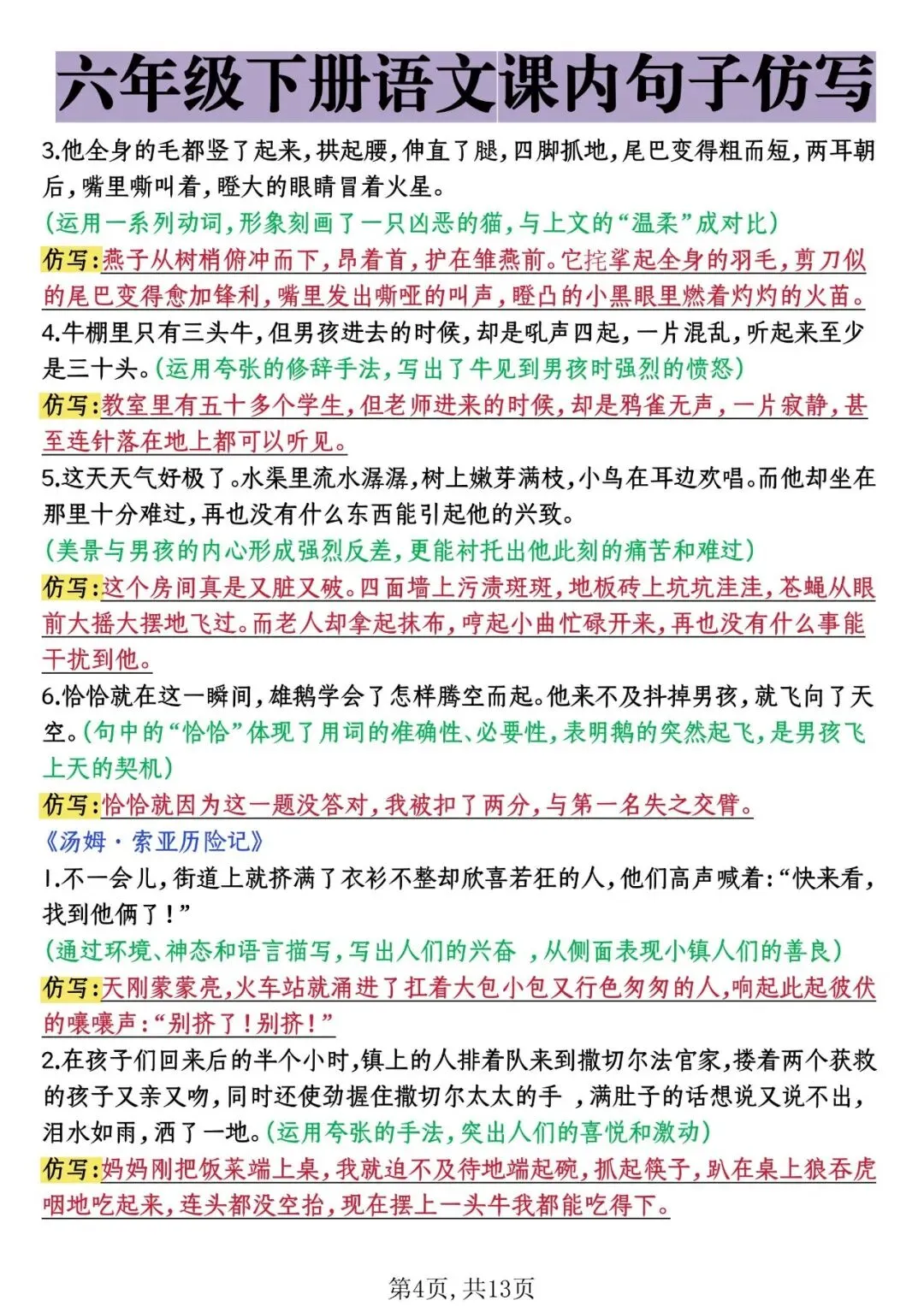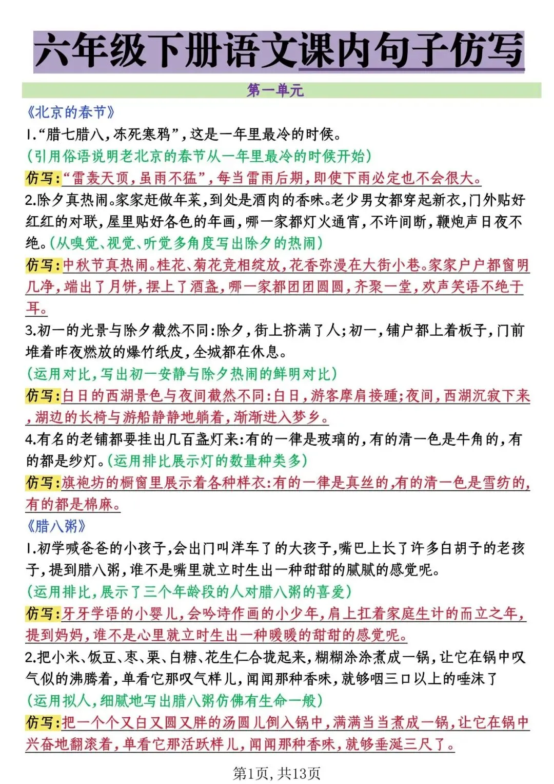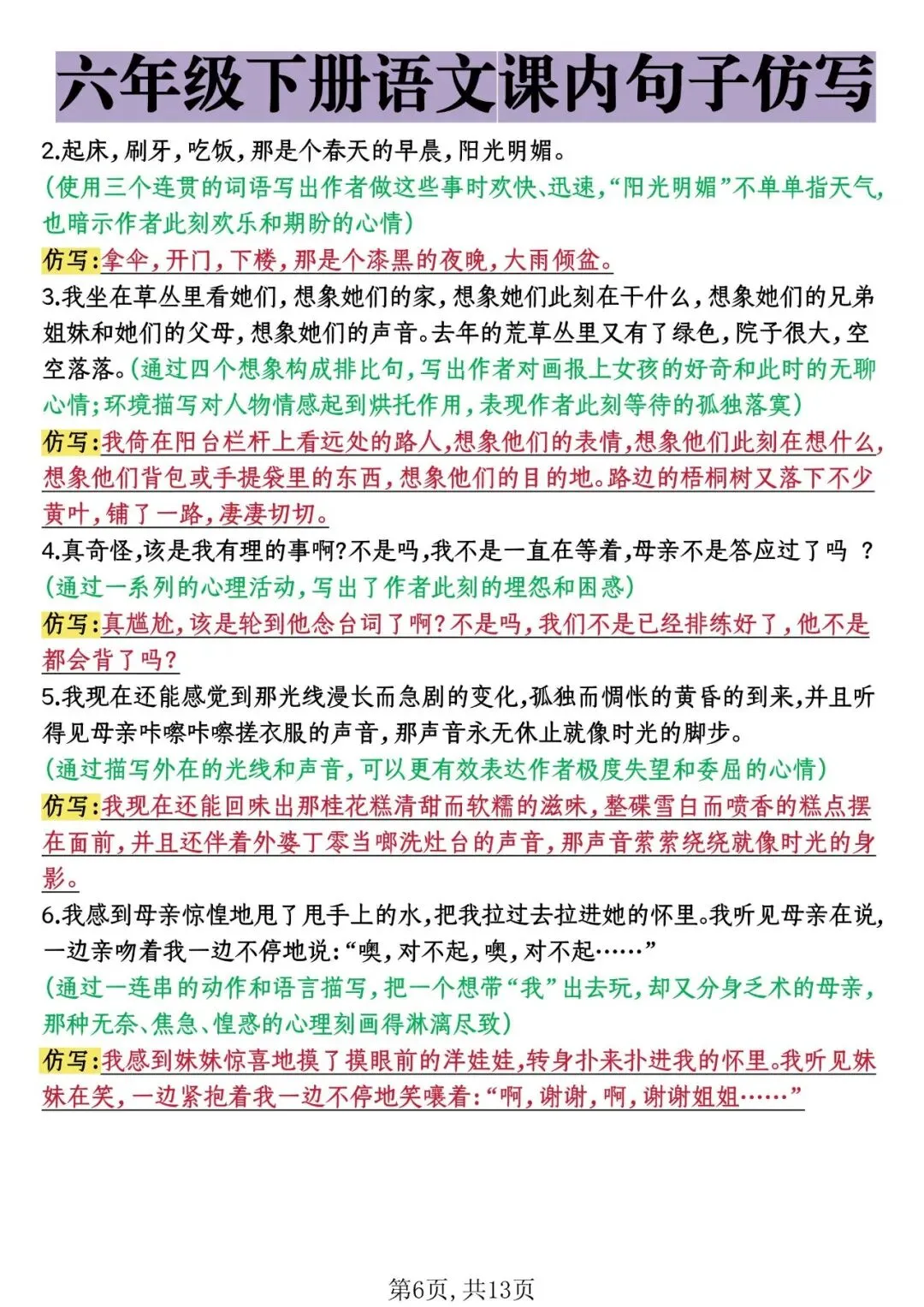 26年春六年级下册课内句子仿写,电子版可打印