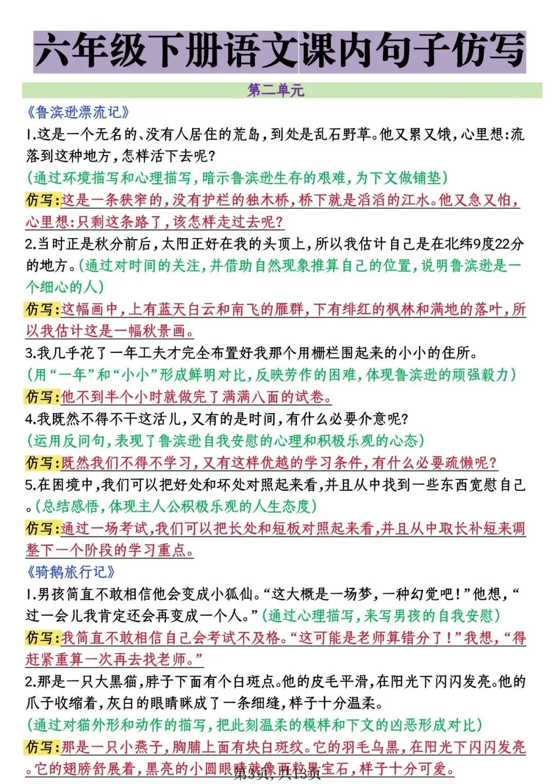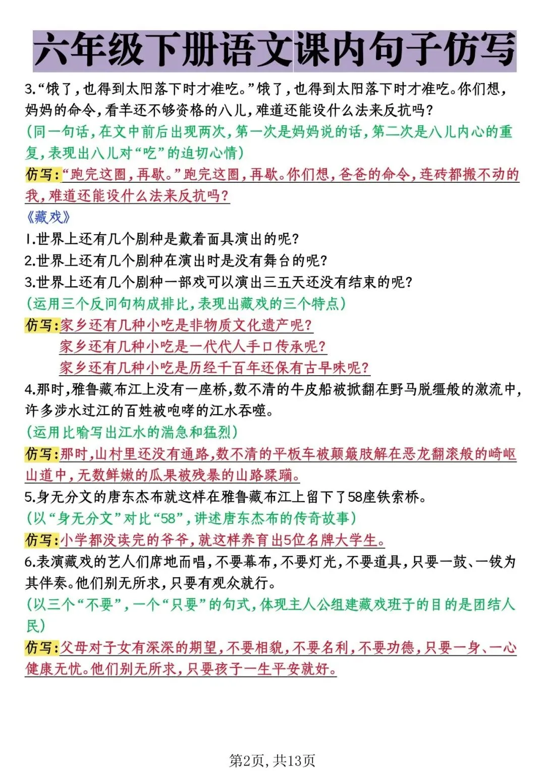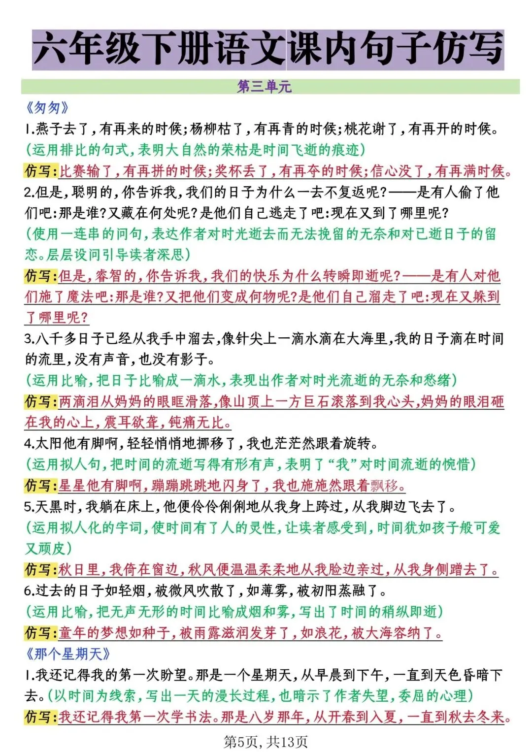 26年春六年级下册课内句子仿写,电子版可打印
