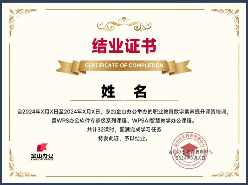 1)结业证书:完成培训内容+签到全勤;