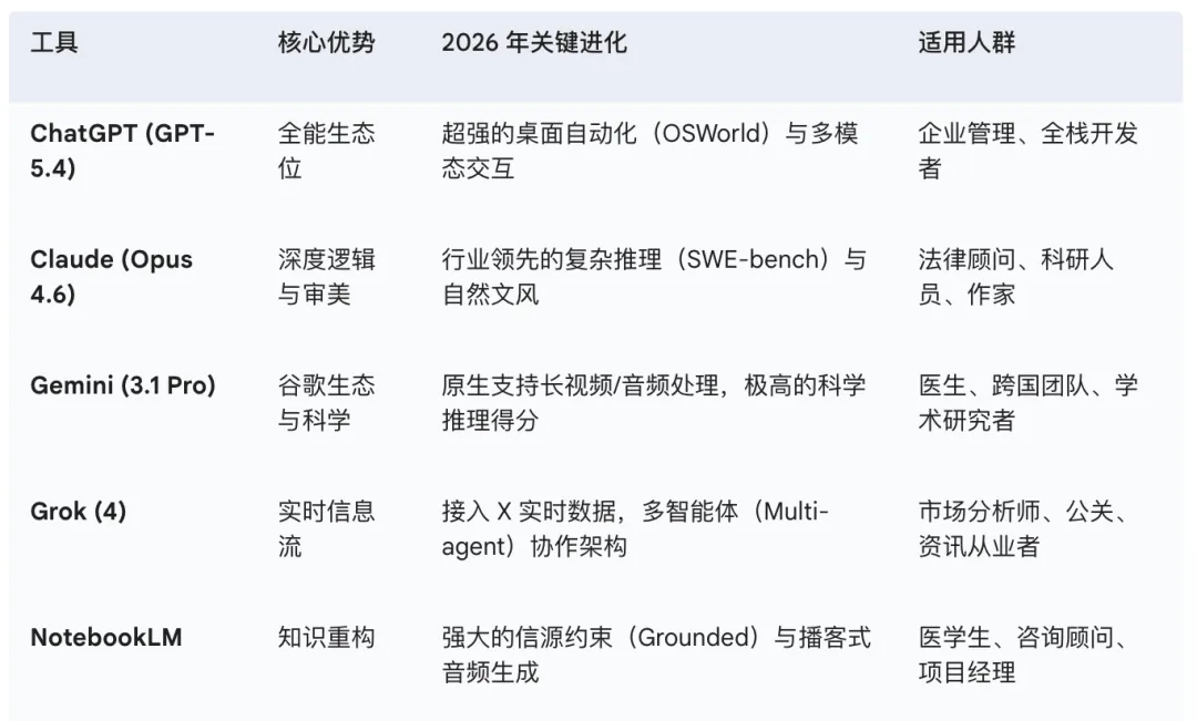 五款AI工具全景评测:ChatGPT、Claude、Gemini、Grok、NotebookLM如何重塑职场与医疗