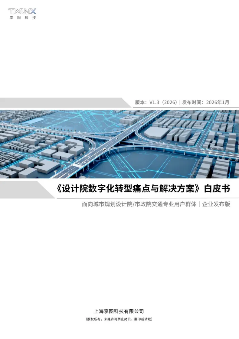 本白皮书聚焦城市规划、市政及交通设计院数字化转型痛点,系统剖析行业在体制约束、市场竞争、增量放缓、利润承压下的现实困境,指出传统以项目交付为核心的模式已难以适应数据要素与智慧交通新趋势,明确转型核心是从“设计交付”向“数据资产+平台运营”升级。白皮书结合政策导向与市场机遇,提出以交通一张图(TIM)为底座的全流程解决方案,为设计院提供可落地、可复制、可盈利的转型路径。