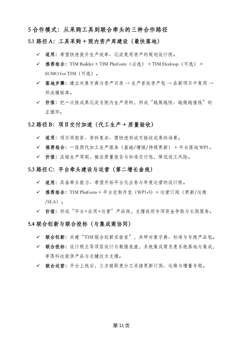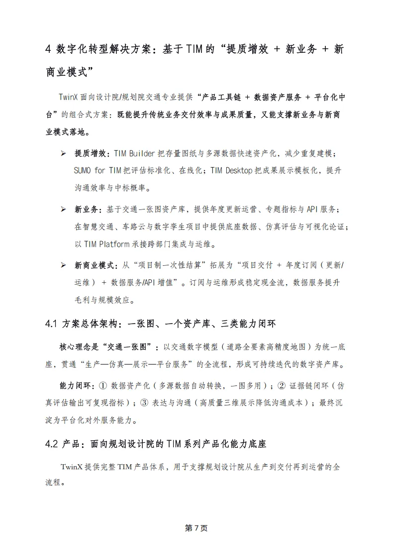 方案针对数据割裂、成果难复用、评估不量化、汇报效率低、转型无收益等核心痛点,构建“一张图、一个资产库、三类能力闭环”总体架构,覆盖数据资产化、仿真证据链、可视化表达与平台化服务。依托TIM Builder、SUMO for TIM、TIM Desktop、TIM Platform四大产品,搭配代加工生产与定制开发两类服务,实现传统业务提质增效与新业务开拓并行推进。 转型方向涵盖交通一张图运营、仿真评估产品化、智慧交通平台集成、车路云一体化规划、应急推演五大高价值赛道,形成项目交付、年度订阅、数据服务多元收入结构。合作模式分为工具采购、项目代工、平台牵头、联合投标四种,支持三阶段落地与三条线并行实施,兼顾存量业务稳定与增量业务突破。