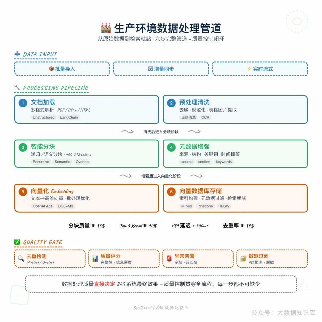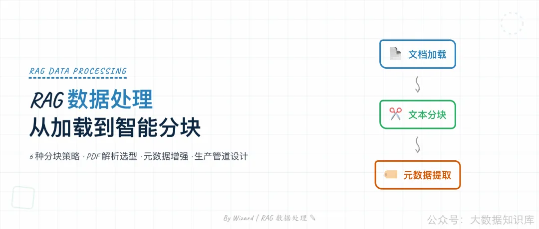 数据处理是 RAG 系统的第一阶段,通过文档加载→文本分块→元数据提取三步,将原始文档转化为可检索的知识单元,分块策略的选择对检索质量影响显著。