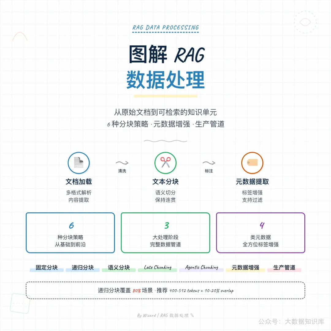 数据处理就像”整理图书馆”——你需要把杂乱的书籍(原始文档)清理干净、分类整理、贴上标签,这样读者(检索系统)才能快速找到需要的内容。分块就像给书”做书签”,标记出关键章节,方便查阅。