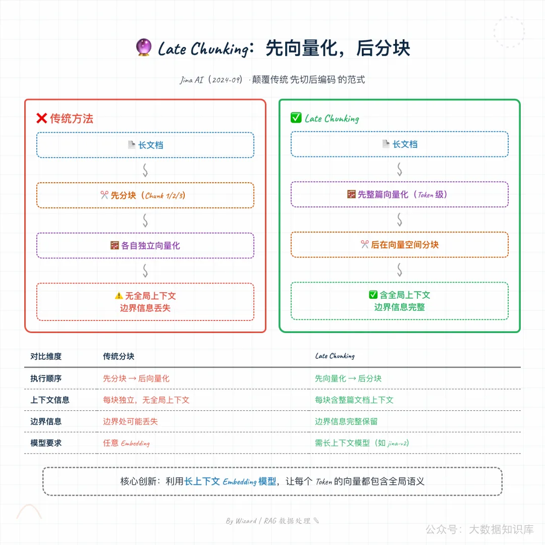 | Late Chunking | 先对整篇文档向量化,再分块 | 保留全局上下文 |
