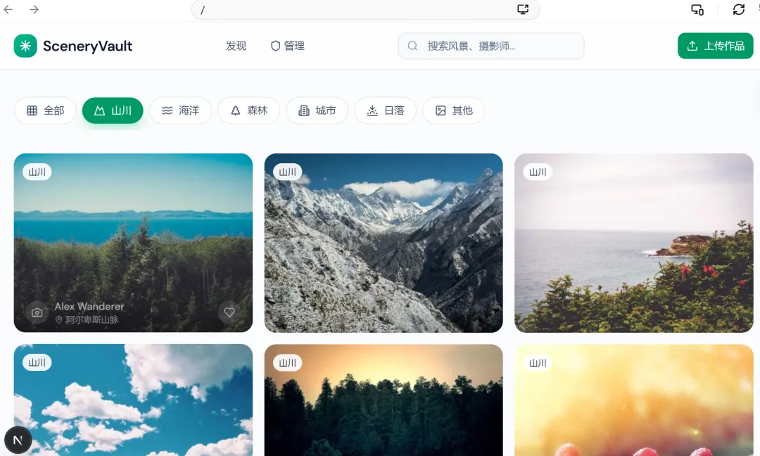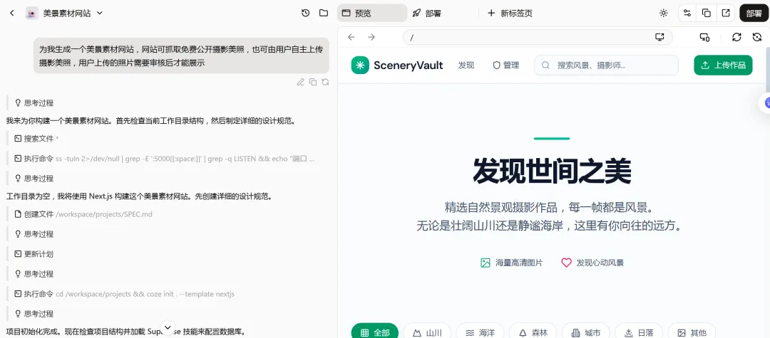 进入扣子编程后,直接在对话框输入:为我生成一个美景素材网站。