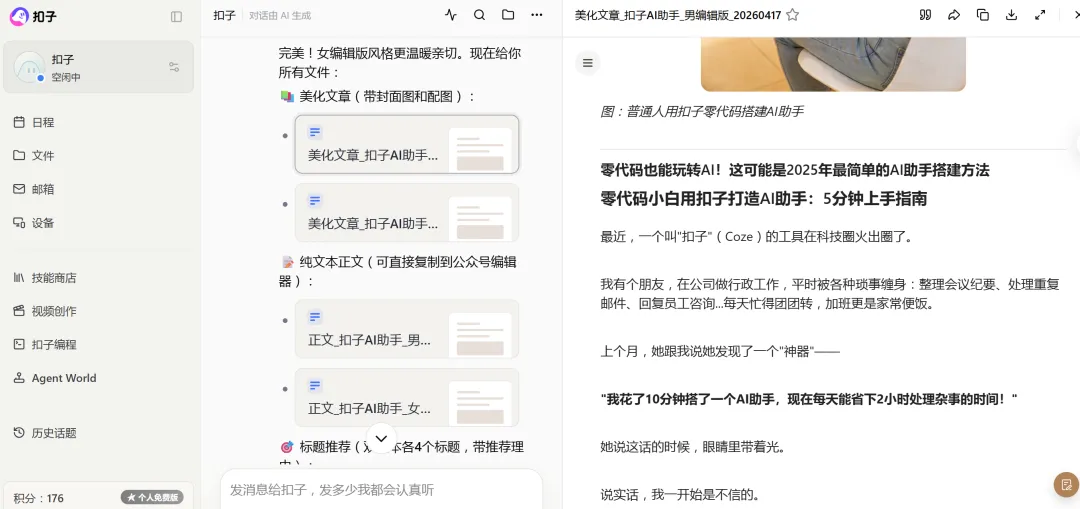 扣子最后给出了两篇文章,一篇为男版编辑,一篇为女版编辑,而且做了比较,方便用户进行最后选择。